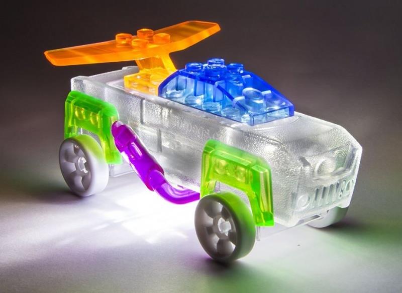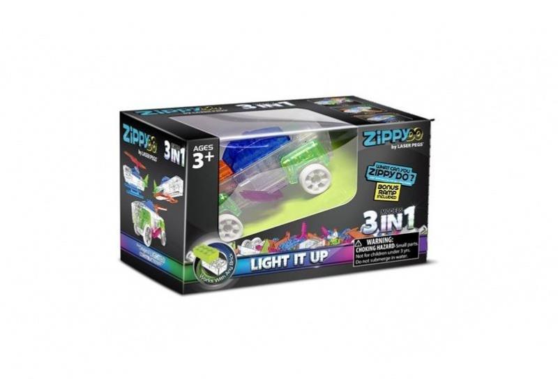 Build three light up vehicles with the Zippy Do from Laser Pegs. The Zippy Do comes with a core that can light up or flash, 22 colorful interchangeable pieces and instructions to build a Helicopter, Jet and Car. The packaging even transforms into a ramp for launching your Zippy Do into the air! Just kick your imagination into gear and swap pieces in and out to build your own unique driving and flying machines.