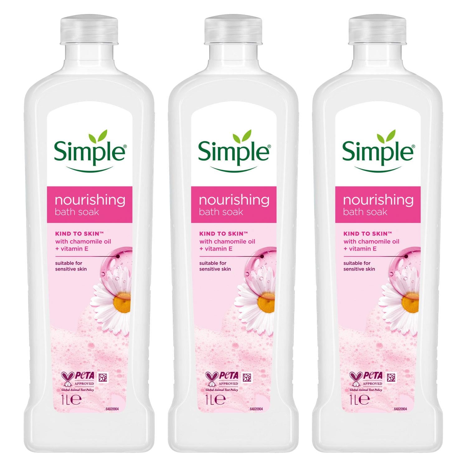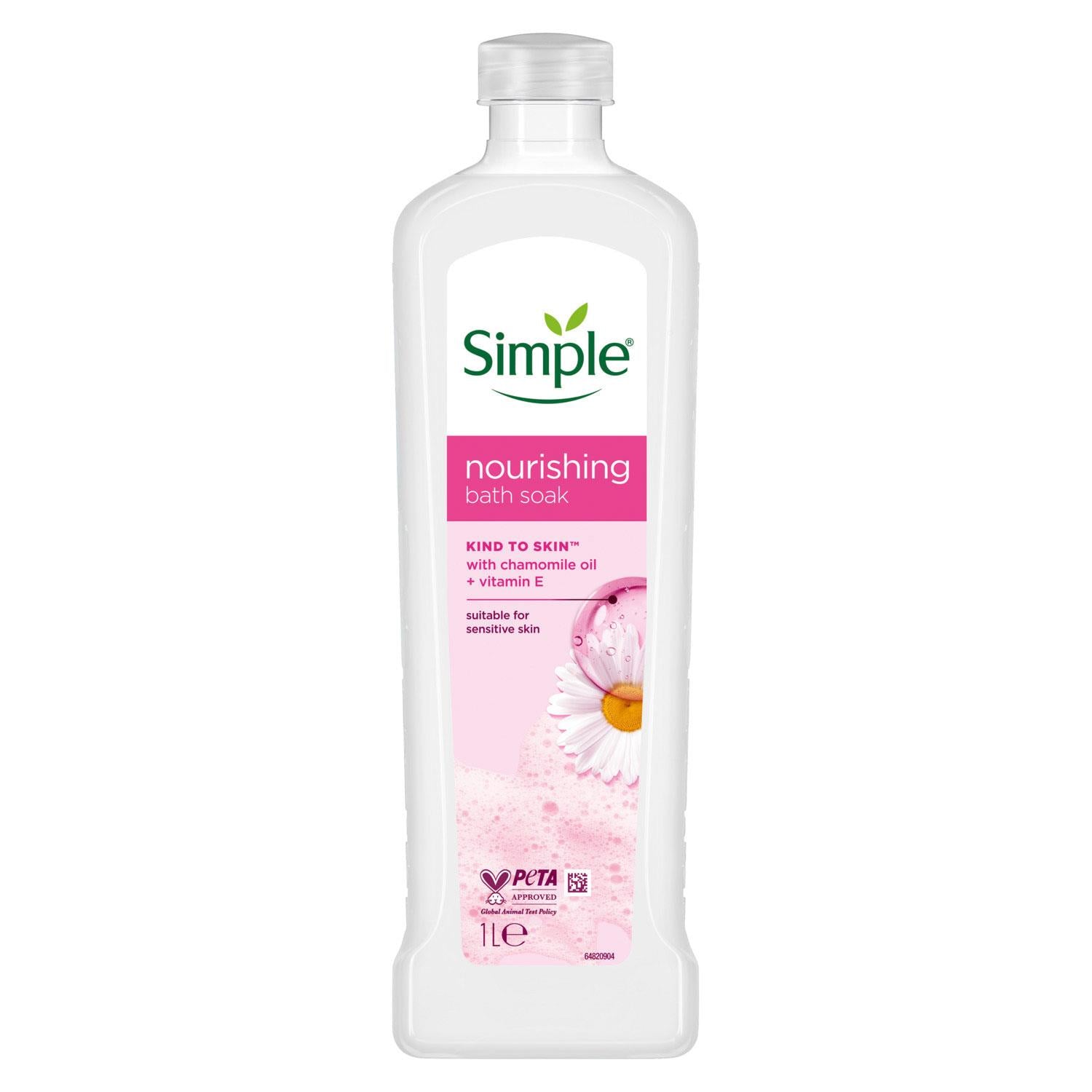 Smile, its simple. Simple has been the expert in sensitive skin care since launching the first perfume and colour-free soap in 1960. Weve stayed committed to our original philosophy of creating skin care and cleansing products suitable for all skin types. From this, we have learnt that if something is as delicate and precious as skin, it deserves only the kindest care. Simple says no to artificial perfumes, colours and harsh chemicals that can upset your skin. Instead, we use only the purest possible, skin-loving ingredients, so you can trust all our products to be kind to sensitive skin. Choose Simple Kind to Skin Nourishing Bath Soak for hydrated and soft skin. Free from soap, artificial colours and harsh chemicals, this bath product contains a gentle blend of pro-vitamin B5, vitamin E and chamomile oil. Our bath soaks are suitable for even the most sensitive skin. How to use: Pour Simple Kind to Skin Nourishing Bath Soak under warm running water to create a rich foam. Avoid contact with eyes. For gentle cleansing and skin care, be sure to also try our Simple Kind to Skin Refreshing and Sensitive shower gels and bath products. *excluding cap and label