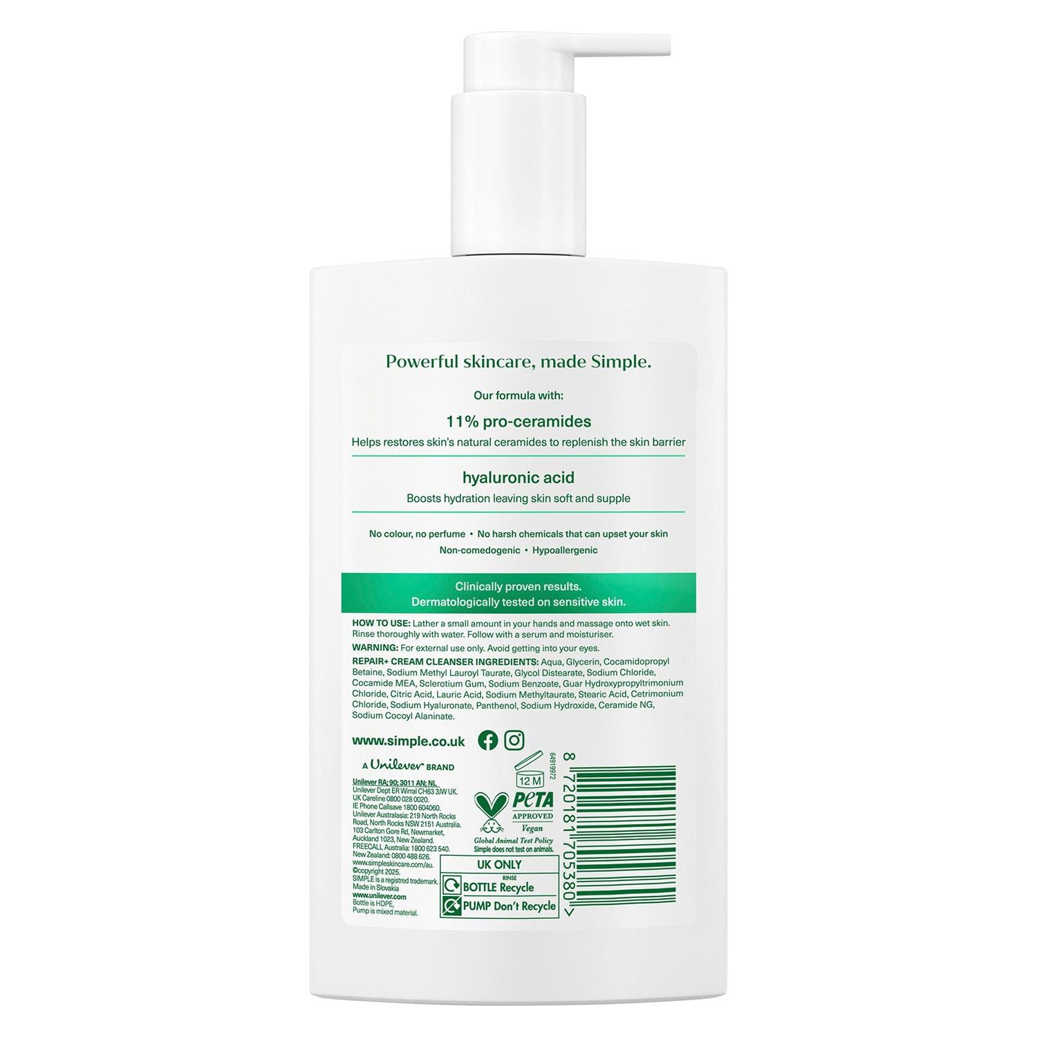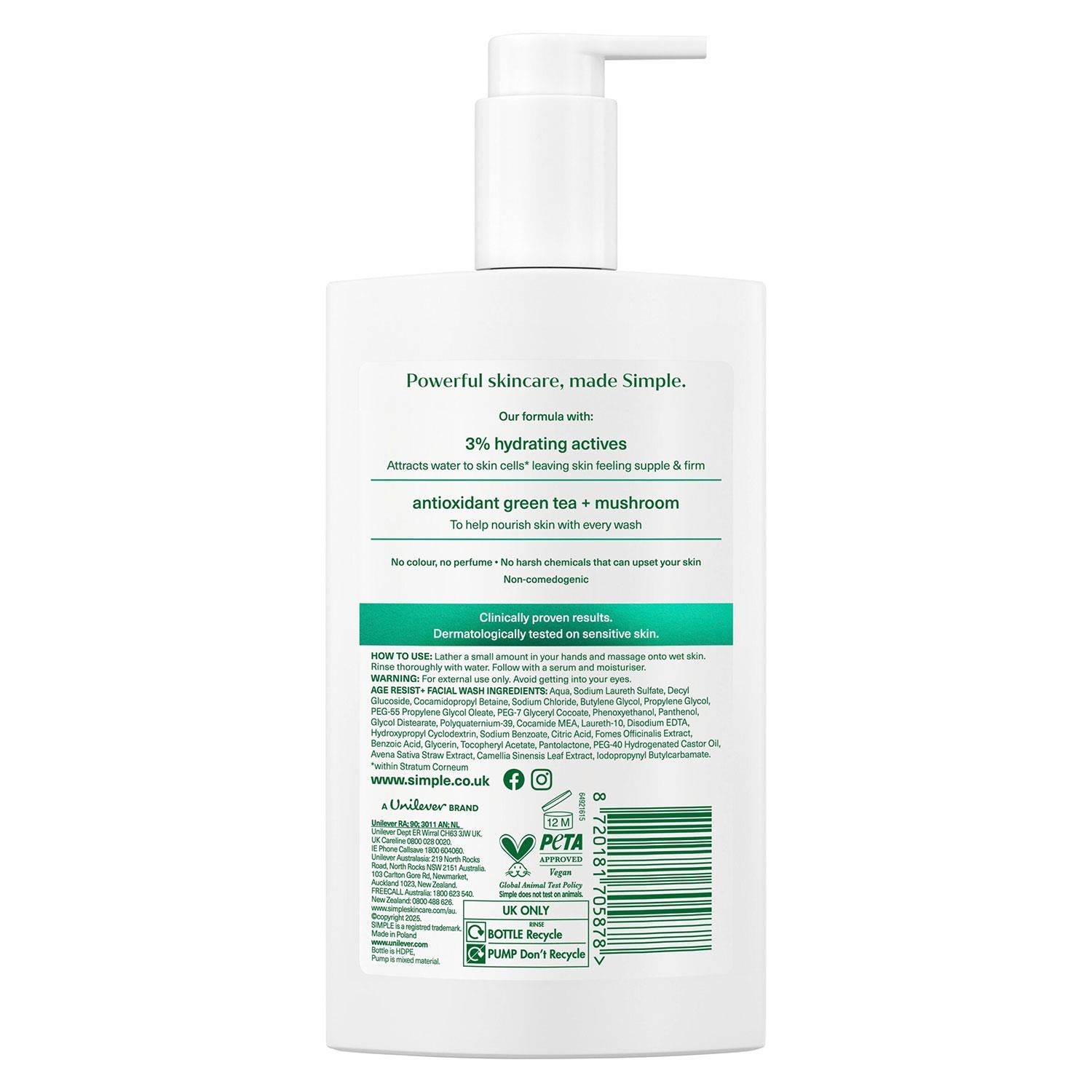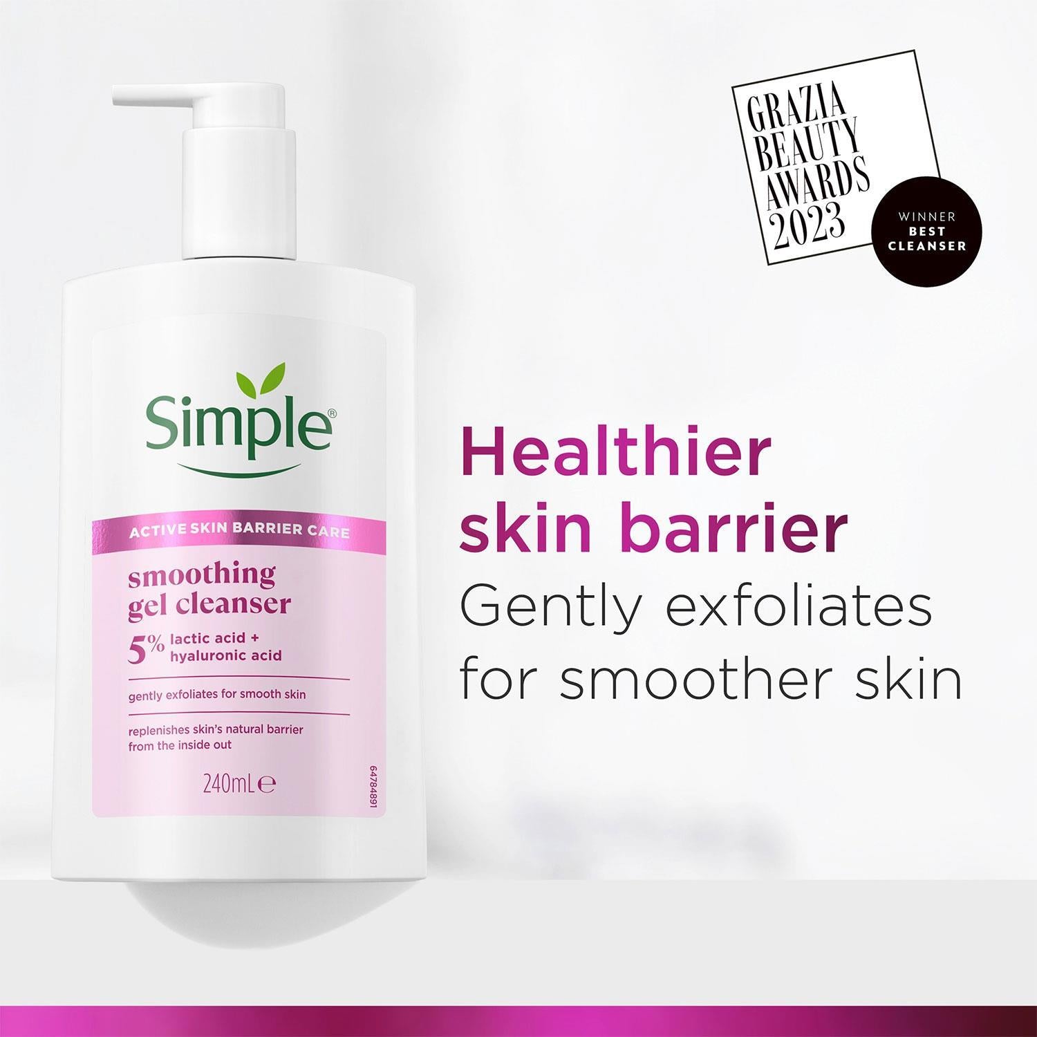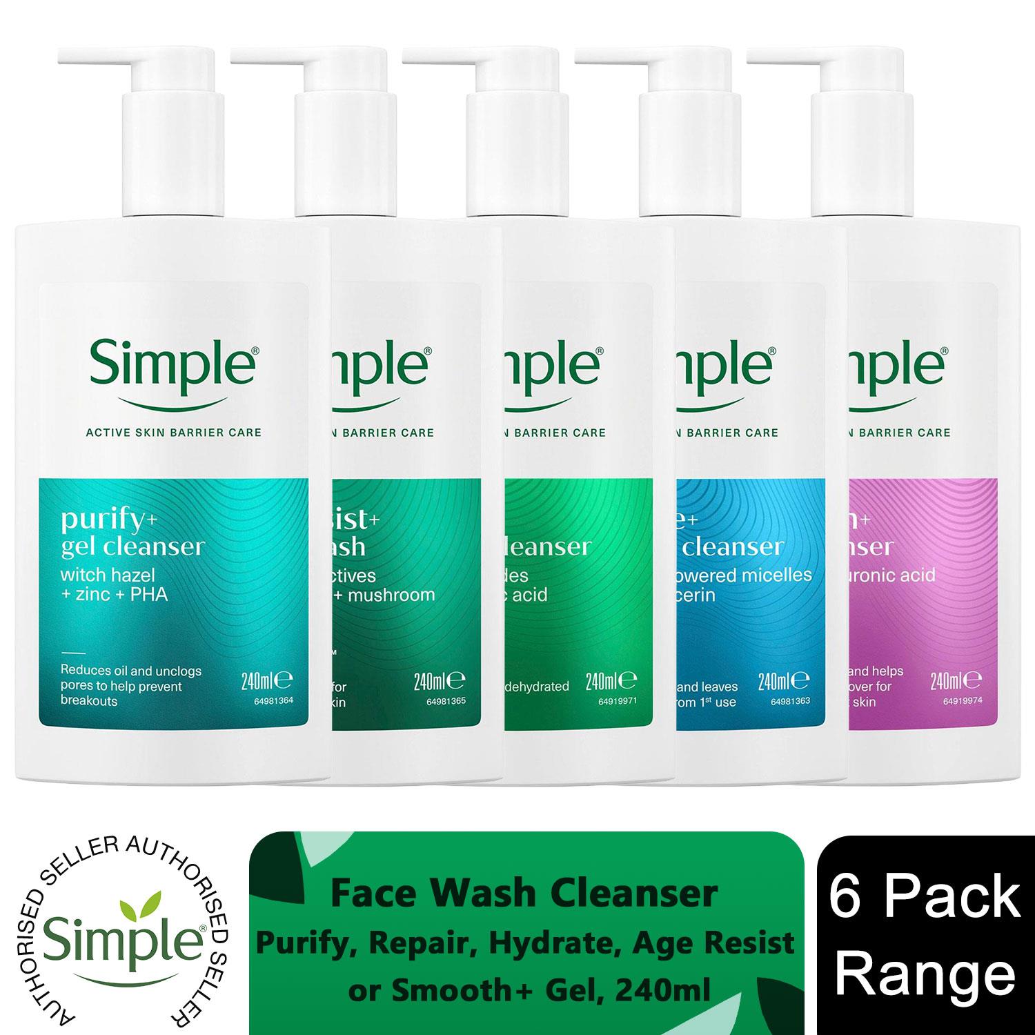 Simple Face Wash Cleanser Purify, Repair, Hydrate, Age Resist, Smooth+ Gel 240ml, 6 Pack Experience complete skincare with the Simple Face Wash Cleanser. Designed for daily use, this gentle yet effective gel cleanser helps purify, repair, hydrate, and protect your skin while promoting a smoother, youthful appearance. Ideal for all skin types, including sensitive skin, it leaves your face refreshed, clean, and balanced without stripping natural moisture. Features: Gently removes dirt, oil, and impurities Hydrates and softens skin for a smooth texture Supports skin barrier repair and protection Age resist formula helps maintain youthful skin Dermatologically tested, fragrance-free, suitable for sensitive skin Lightweight, non-greasy gel for daily use How to Use: Wet your face with lukewarm water. Apply a small amount of the gel cleanser to your face. Massage gently in circular motions for 30�60 seconds. Rinse thoroughly with water and pat dry. Follow with moisturizer or serum as needed. Ingredients: Aqua, Glycerin, Cocamidopropyl Betaine, Panthenol, Sodium PCA, Tocopherol, Poloxamer 184, Additional Skin-Repair Actives Safety Warnings: For external use only. Avoid contact with eyes; rinse thoroughly if contact occurs. Discontinue use if irritation develops. Keep out of reach of children. Store in a cool, dry place away from direct sunlight. Box Contains: 6x Simple Face Wash Cleanser Range 240ml, (Select your Type from Dropdown) Available Options: 6x Simple Purify+ Gel Facial Cleanser, 240ml 6x Simple Repair+ Cream Cleanser, 240ml 6x Simple Hydrate+ Micellar Facial Cleanser, 240ml 6x Simple Age Resist+ Facial Wash Anti-Ageing, 240ml 6x Simple Smooth+ Gel Facial Cleanser, 240ml
