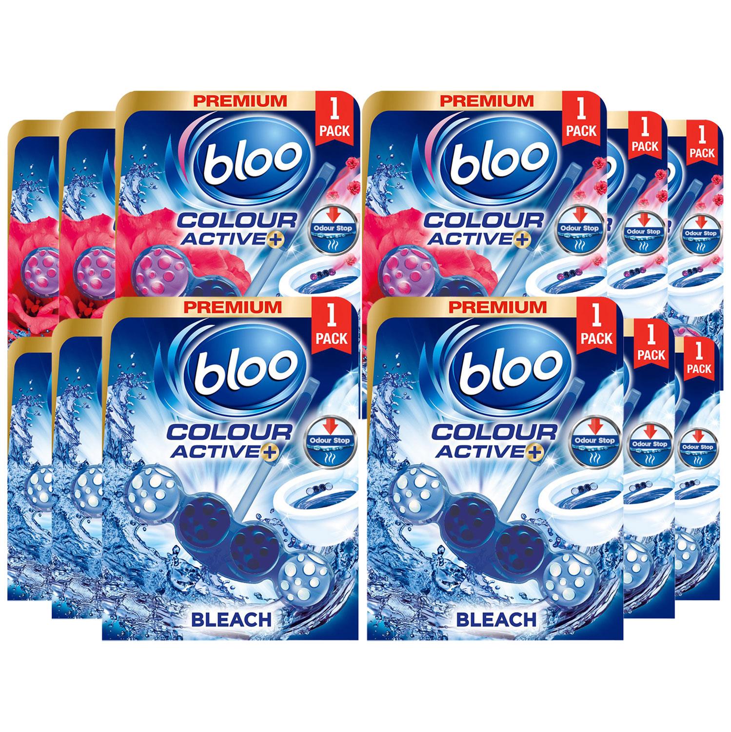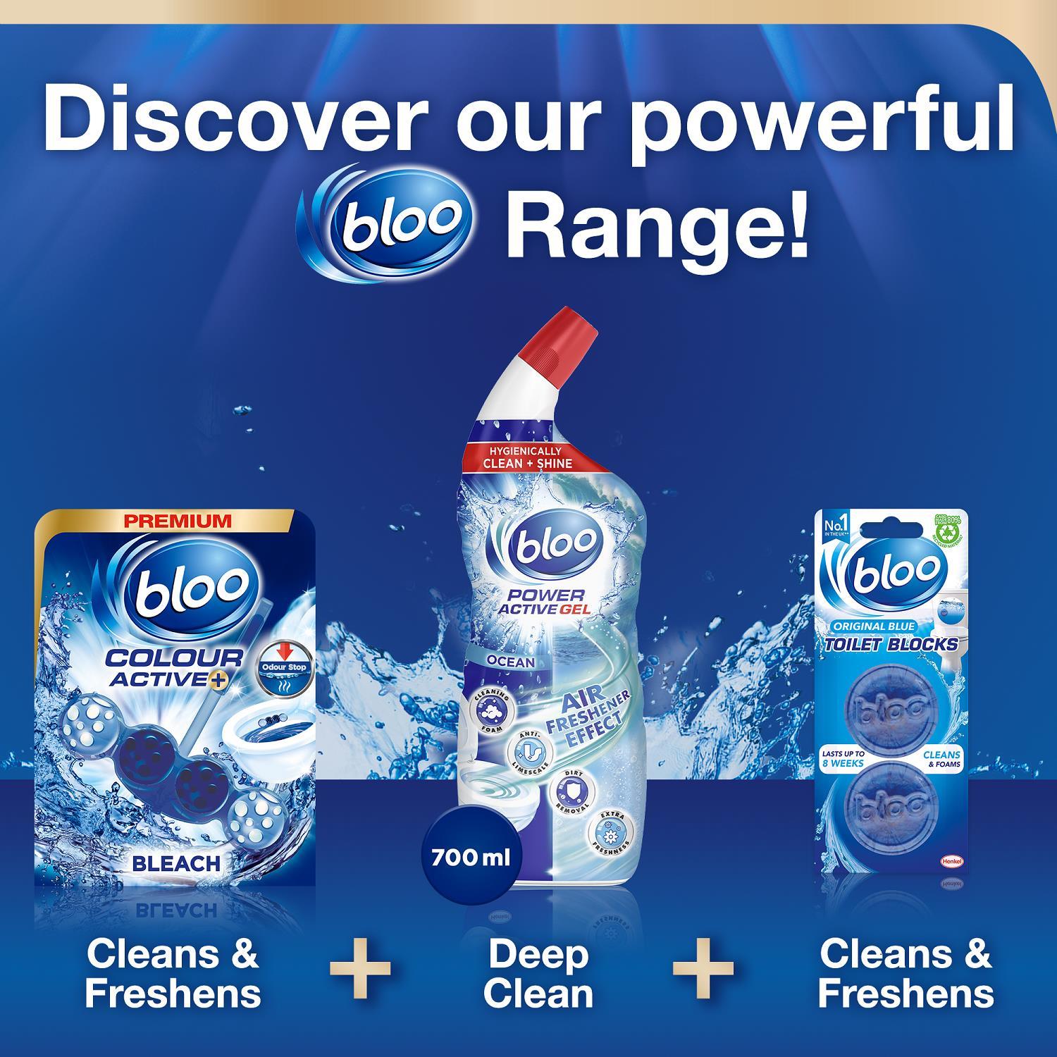 Bloo Colour Active Fresh Flower & Bleach Toilet Rim Block Odour Stop 6 pk of 50g Bloo Colour Active Fresh Flowers Toilet Rim Block is an innovative rim block that combines design and function. A hygienically clean and fresh toilet with every flush! Combining power balls and blue water technology, it actively cleans between flushes. Safe for use in septic tanks With its unique Bloo 4 functions formula, Bloo Colour Active prevents limescale, provides cleaning foam, dirt protection and extra freshness for your toilet. 100% anti-limescale to keep the loo hygienically clean in between deep cleans and a strong foaming action preventing dirt and grime Simply place the product on the rim of your toilet, adjust it to the water flow and experience boosted freshness and cleanliness with every flush. Features: A boost of hygiene scent flush after flush. Bloo rim block turns the water blue for a unique sensorial experience. 100% anti-limescale and kills 99.9% germ for a thorough clean. Cleans the bowl with every flush and turns your water blue With a concentrated cleaning action designed to prevent limescale. Lasts up to 240 flushes. Safe for use in septic tanks. Ingredients: Fresh Flower: >30% Anionic Surfactants, 5-15% Non-Ionic Surfactants, Further ingredients: Perfume (Butylphenyl Methylpropional, Alpha-Isomethyl Ionene). Bleach: Sodium Sulfate, sodium c10-13 alkyl benzenesulfonate, sodium c14-16 olefin sulfonate, ceteareth-25, perfume remainder, aqua, sodium carbonate, troclosene sodium, dihydrate, perfume. Safety Warning: Causes skin irritation. Causes severe eye irritation. If medical advice is needed, have the product container or label at hand. Keep out of reach of children. Wear protective gloves/eye protection. If on the skin: wash with plenty of water. If in the eyes: rinse cautiously with water for several minutes. Remove contact lenses, if present and easy to do. Continue rinsing. If eye irritation persists: Get medical advice/attention. Introduce fully emptied packaging to recycling / municipal waste stream. Box Contains: Bloo Colour Active Fresh Flower & Bleach Toilet Rim Block Odour Stop 6 pk of 50g