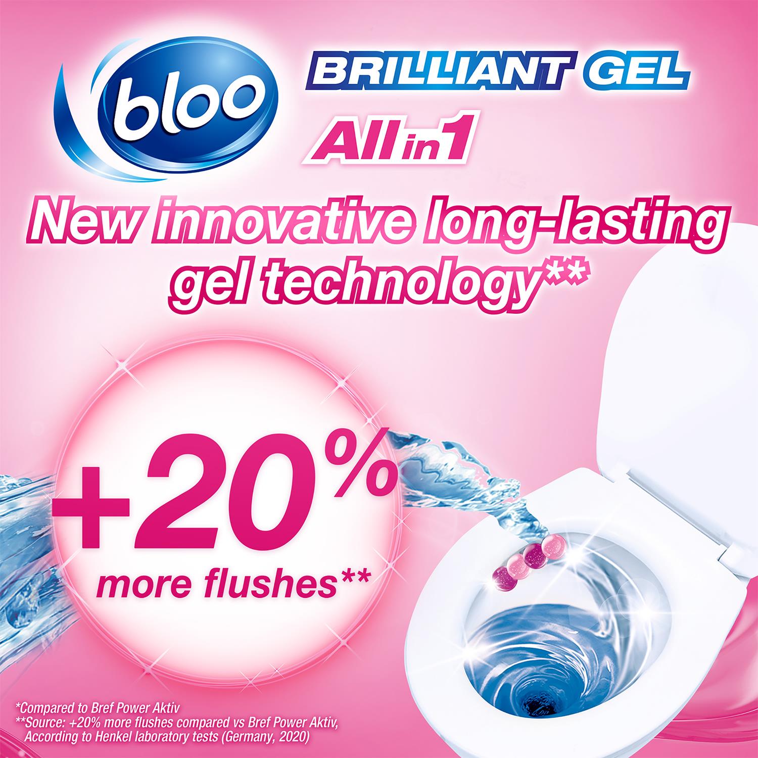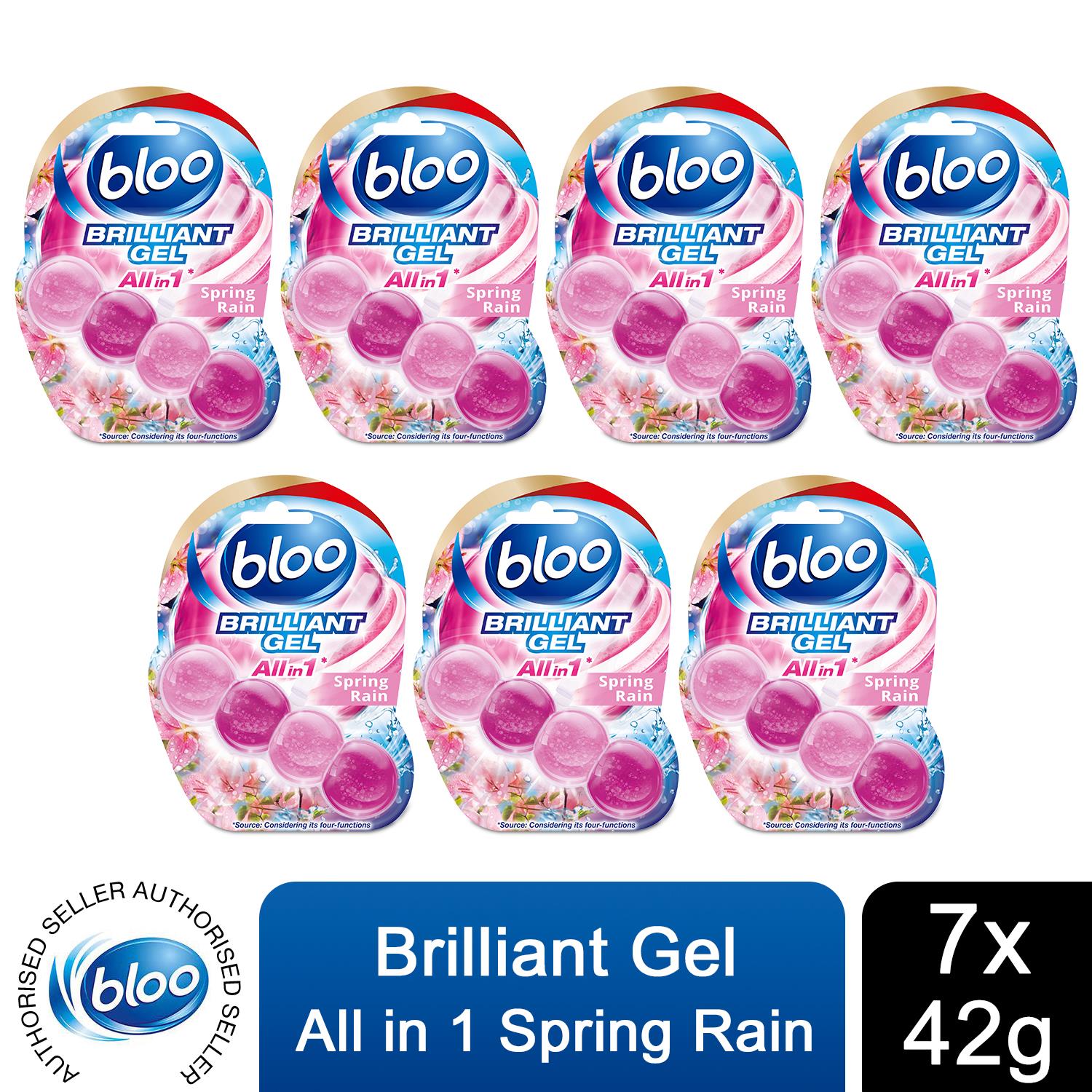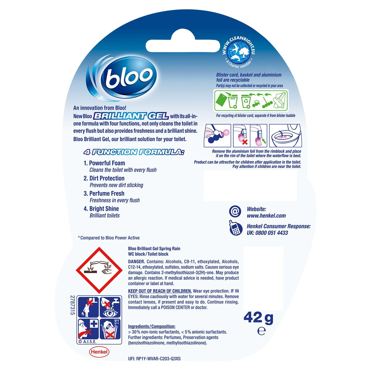 An innovation from Bloo! New Bloo Brilliant Gel with its all-in-one formula with four functions, not only cleans the toilet in every flush but also provides freshness and a brilliant shine. Bloo Brilliant Gel is our brilliant solution for your toilet. Features: Power Foam: Cleans the toilet with every flush Dirt Protect: Prevents new dirt from sticking Perfume Fresh: Freshness in every flush, with a subtle scent inspired by fine fragrances Brilliant Shine: Brilliant toilets, no residues and fast dissolution +20% more flushes: Bloo Brilliant gel provides +20% more flushes vs Power active Rim block Safety Warnings: Contains: Alcohols, C9-11, ethoxylated, Alcohols, C12-14, ethoxylated, sulfates, sodium salts. Causes serious eye damage. Contains 2-methylisothiazol-3(2H)-one. May produce an allergic reaction. Causes skin irritation. Causes serious eye damage. Harmful to aquatic life with long-lasting effects. Keep out of reach of children. Wear protective gloves and eye protection. If Eye contact: Rinse cautiously with water for several minutes. Remove contact lenses, if present and easy to do. Continue rinsing. Box Contains: 7 Pack of Bloo Toilet Rim Blocks Brilliant Gel Spring Rain, 42g