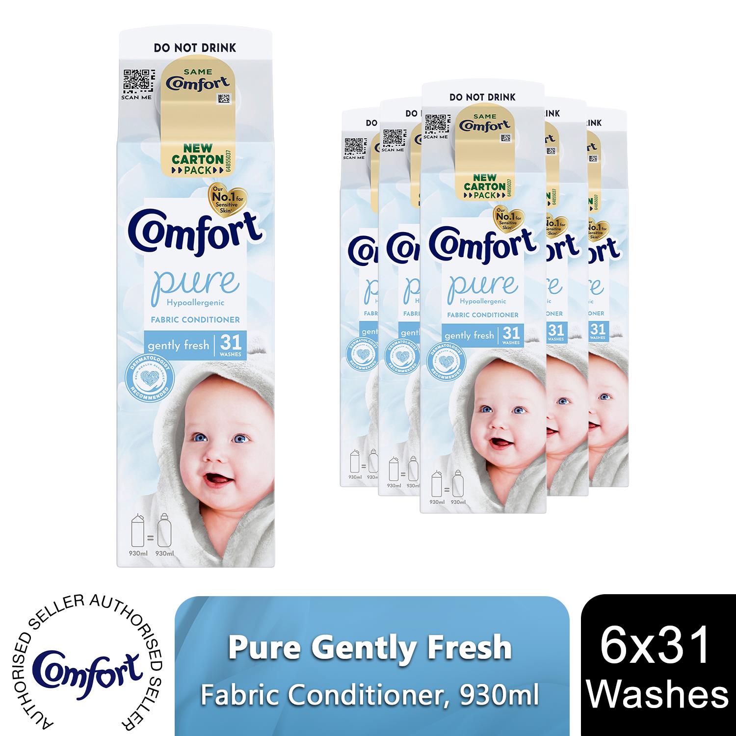 Comfort Pure Gently Fresh Fabric Conditioner 31 Washes Fabric Softener, 930ml, 6pk Comfort Pure Gently Fresh Fabric Conditioner 31 Washes (930ml) provides long-lasting softness and gentle care for all your laundry. Specially formulated to keep fabrics smooth, soft, and pleasantly fresh, this fabric conditioner enhances the comfort and feel of your clothes after every wash. Each 930ml bottle delivers up to 31 washes, offering a convenient and cost-effective way to maintain soft, fresh, and well-cared-for laundry. Features: Long-lasting softness and gentle care for all fabrics Reduces static cling and eases ironing Pure Gently Fresh fragrance leaves laundry delicately scented Suitable for all washing machines and various fabrics Ingredients: 5-15%: Cationic Surfactants; <5%: Perfume, Lactic Acid, Sodium Benzoate. How to Use: Add the recommended dose to the fabric softener compartment of your washing machine according to load size. Suitable for all water temperatures and washing programs. Avoid direct contact with eyes or skin. Keep the bottle closed when not in use and store out of reach of children. Safety Warning: Keep out of reach of children. Avoid contact with eyes and skin. In case of contact with eyes, rinse thoroughly with water immediately. If swallowed, seek medical advice immediately and show the product packaging. Store in a cool, dry place away from direct sunlight and heat. Box contains: 6x Comfort Pure Gently Fresh Fabric Conditioner 930ml (31 Washes)