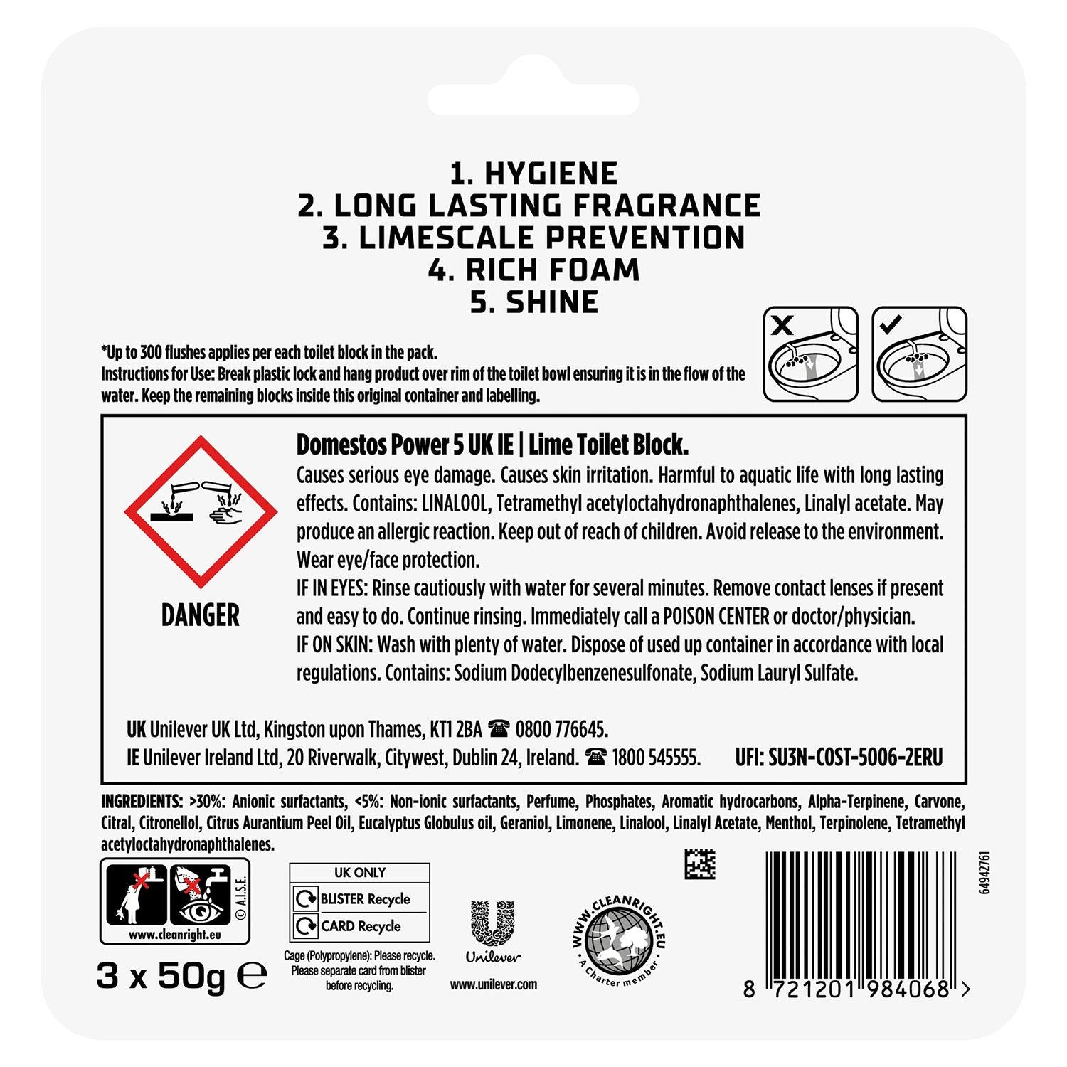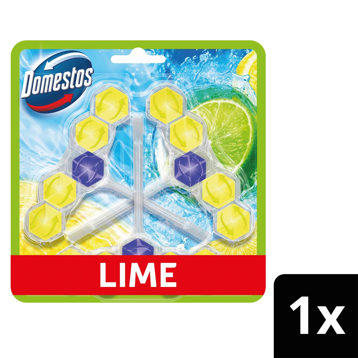 Domestos Power 5 Lime Toilet Rim Block leaves your toilet fresh and clean for up to 300 flushes