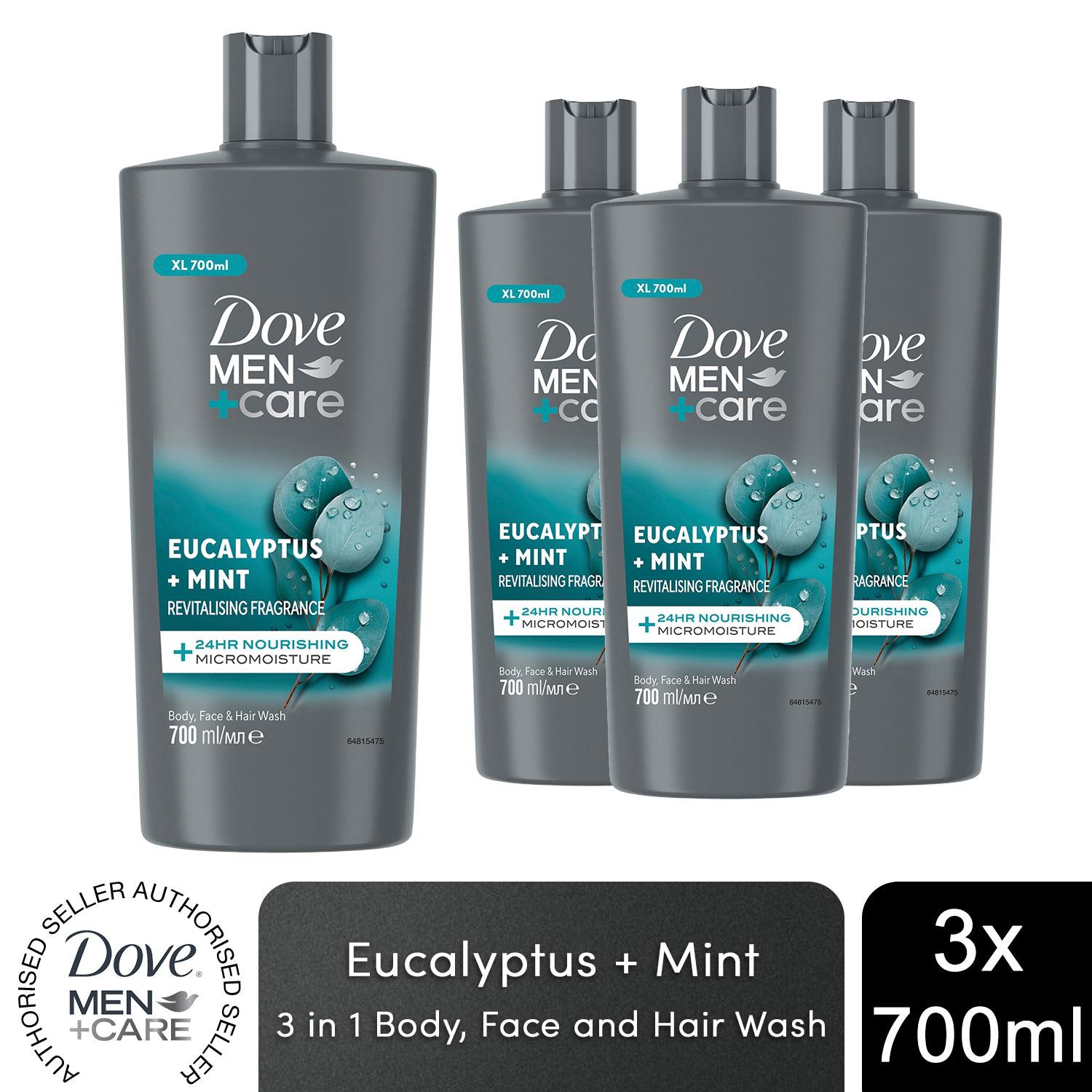 Dove Men+Care 3-in-1 Hair, Face and Body Wash Eucalyptus + Mint 700ml, 3 Pack Dove Men+Care Eucalyptus + Mint 3-in-1 Hair, Face and Body Wash uses 24-hour MicroMoisture technology to nourish your skin continuously throughout the day. Developed specifically for men's skin, our caring formula contains nourishing moisturisers and skin-strengthening nutrients, ensuring your skin feels healthy, hydrated and smooth. Featuring a eucalyptus and mint scent, this moisturising shower gel helps invigorate your senses and makes you feel refreshed. Plus, it saves space in your bathroom or sports bag. All-in-one, simple, and no hassle. For skin that feels healthy, explore our full range of body washes and discover more invigorating fragrances that will take your shower experience to a whole new level. Our body washes come in 100% recycled plastic bottles*, so you can feel good about switching to Dove Men+Care. We want to give men the courage to care for themselves and each other. Dove Men+Care puts care at the centre of a man's strength, helping you care for yourself so you can be there for others. *excluding cap and labels Features: Dove Men+Care Eucalyptus + Mint 3-in-1 Hair, Face and Body Wash provides 24-hour nourishment Featuring MicroMoisture technology, this shower gel keeps your skin feeling smooth and hydrated all day This body cleanser makes you feel refreshed with an invigorating eucalyptus and mint scent Designed specifically for men's skin, our shower gel helps to lock in your skin's natural moisture This body wash for men is made with nourishing moisturisers and skin-strengthening nutrients for healthy-feeling skin Dove Men+Care Eucalyptus + Mint Body Wash comes in a bottle made from 100% recycled plastic How to Use: How to use: Squeeze a generous amount of Dove Men+Care Eucalyptus + Mint 3-in-1 Hair, Face and Body Wash into your palms. Massage the hydrating body cleanser onto your skin before rinsing off. Ingredients: Aqua, Sodium Laureth Sulfate, Sodium Chloride, Cocamidopropyl Betaine, Sodium Lauroyl Isethionate, Glycerin, Acrylates Copolymer, Parfum, Sodium Benzoate, Stearic Acid, Lauric Acid, Sodium Hydroxide, Hydroxystearic Acid, Palmitic Acid, Tetrasodium EDTA, Sodium Isethionate, Citric Acid, PPG-6, Mentha Aquatica Leaf Extract, Eucalyptus Globulus Oil, Linalool, Tetramethyl Acetyloctahydronaphthalenes, CI 17200, CI 19140, CI 42090 Box Contains: 3x Dove Men+Care 3-in-1 Hair, Face and Body Wash, 700ml