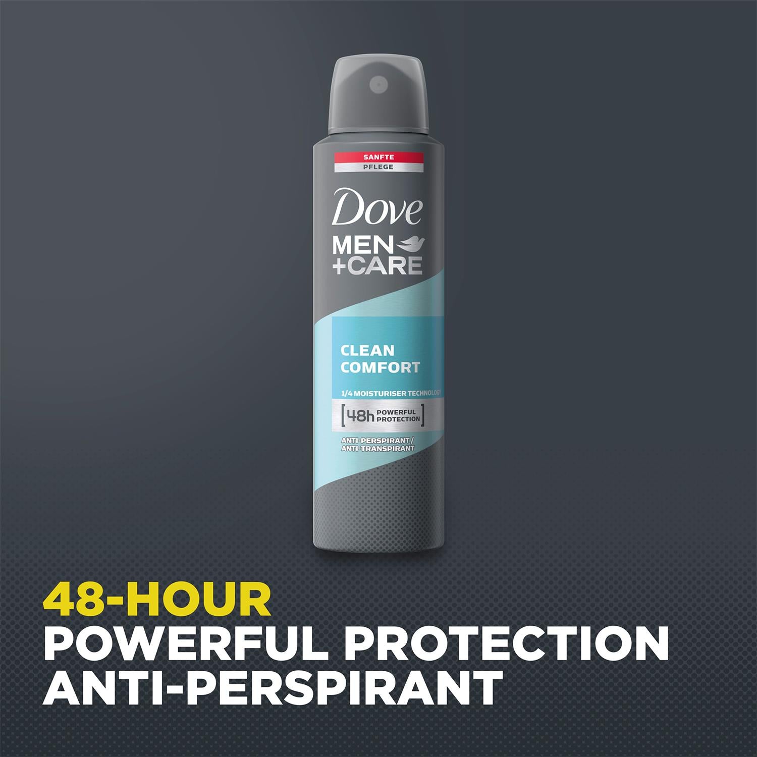 Antiperspirant 250ml: Anti-perspirant that can keep up with your busy schedule. If you want to stop sweat from dominating your day, try Dove Men+Care Clean Comfort Antiperspirant Aerosol. Engineered specifically for men, this antiperspirant deodorant delivers 48 hours of powerful odour and sweat protection to help you stay fresh all day. Its non-irritant, dermatologically tested formula is specially designed with ¼ moisturiser technology to shield your skin from irritation.