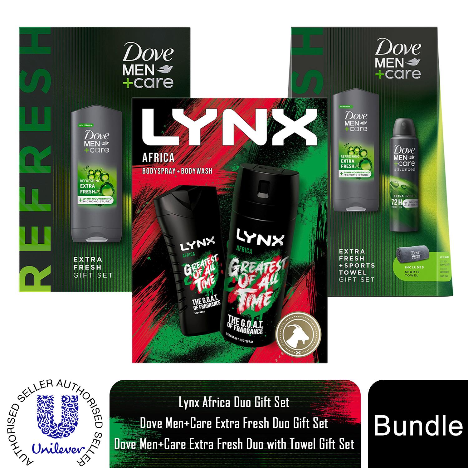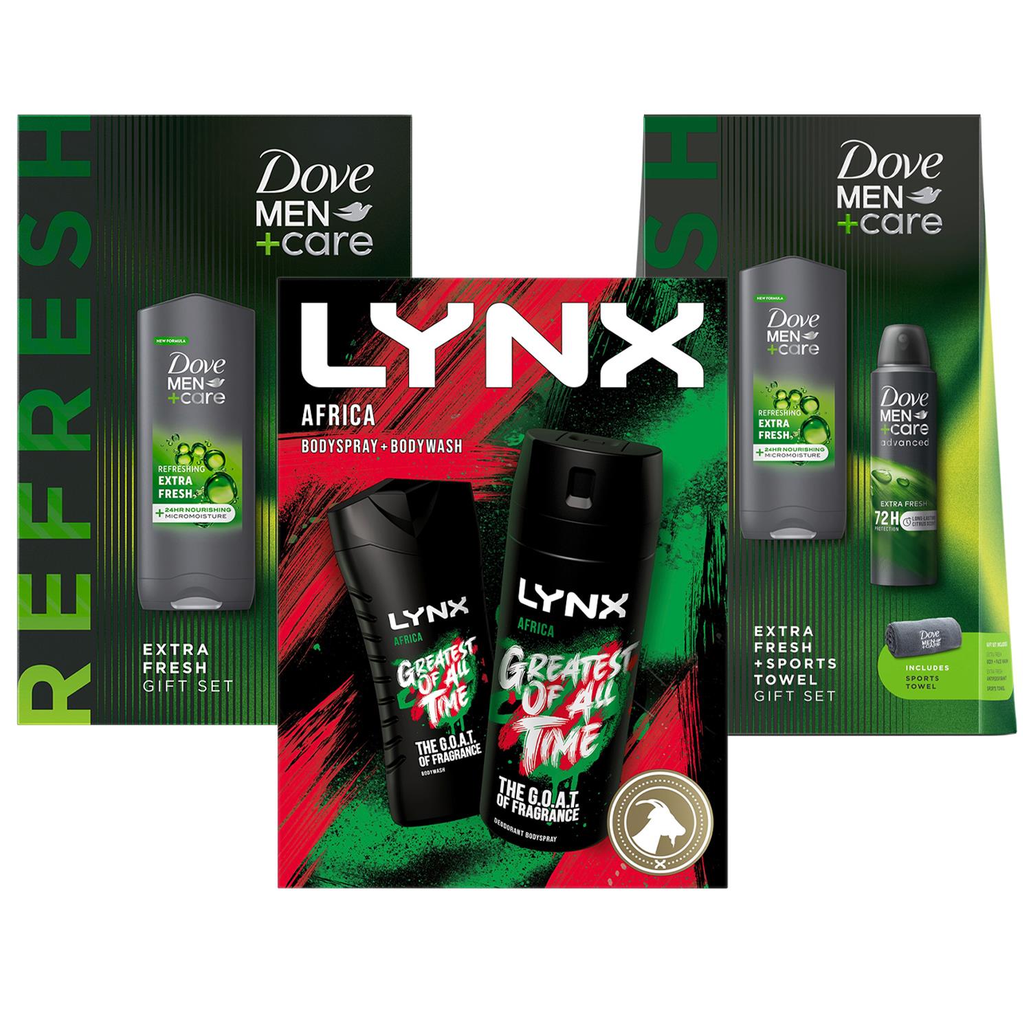 Dove Men+Care Extra Fresh Duo and Lynx Africa Duo Gift Set Bundle for Him