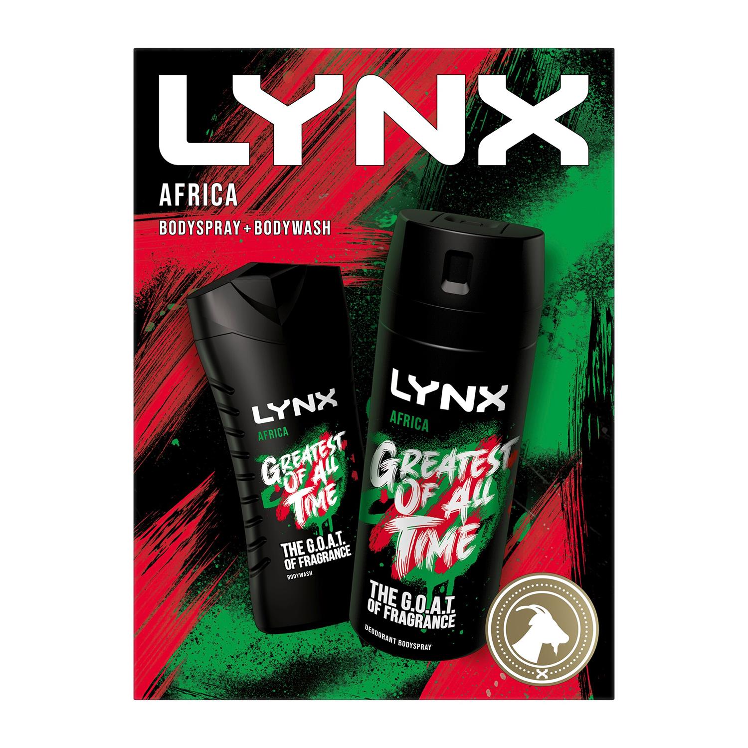 - Lynx Africa G.O.A.T. Duo Gift Set: 1x Body Spray 150ml, 1x Body Wash, 225ml