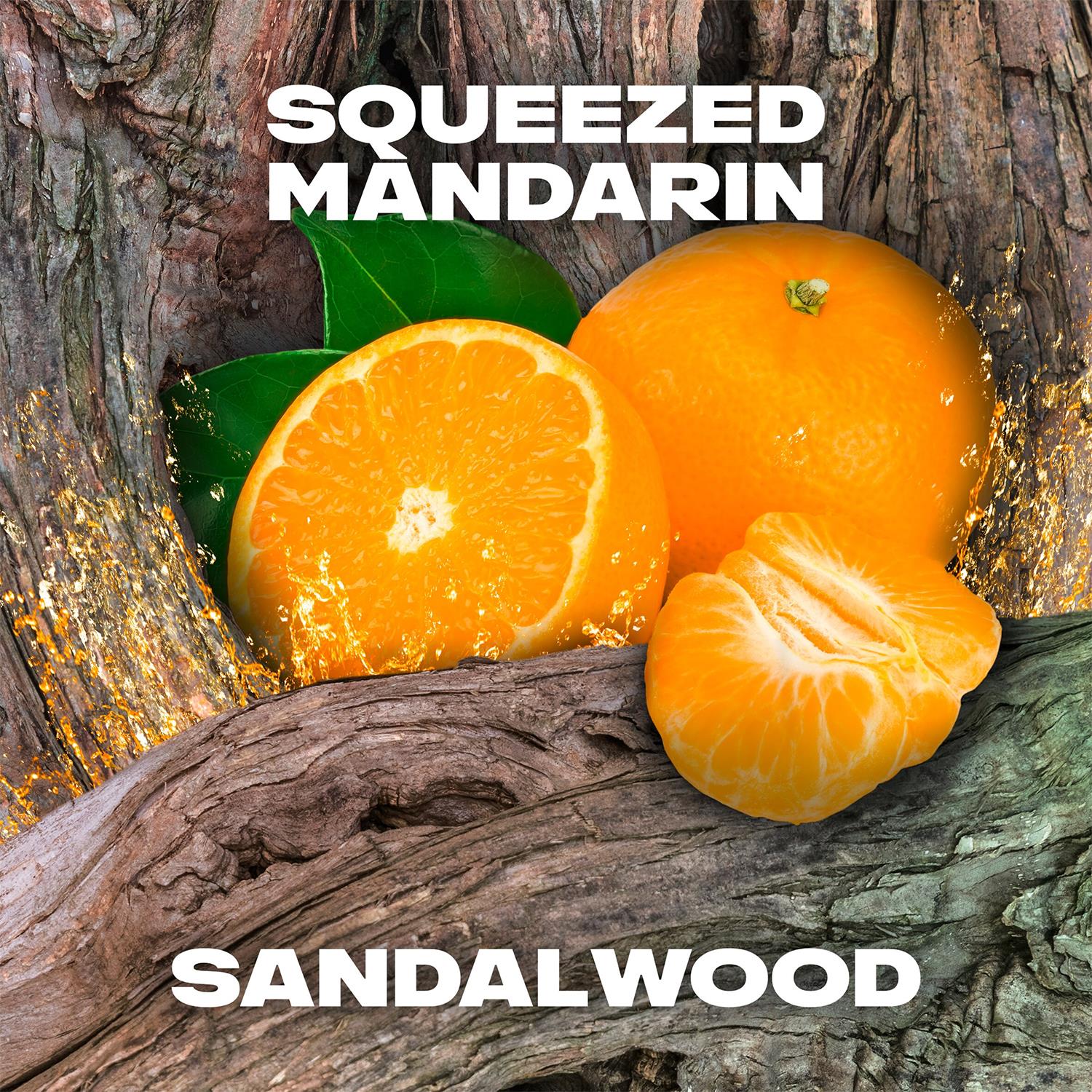 - The body wash dispels odour to keep him feeling and smelling fresh all day with a squeezed mandarin and sandalwood scent