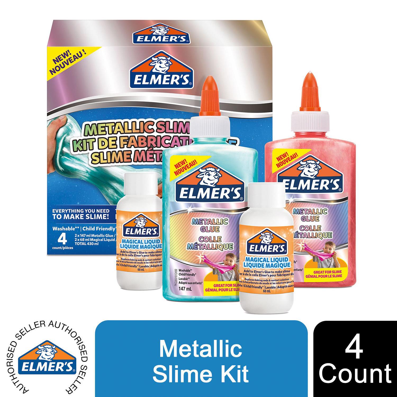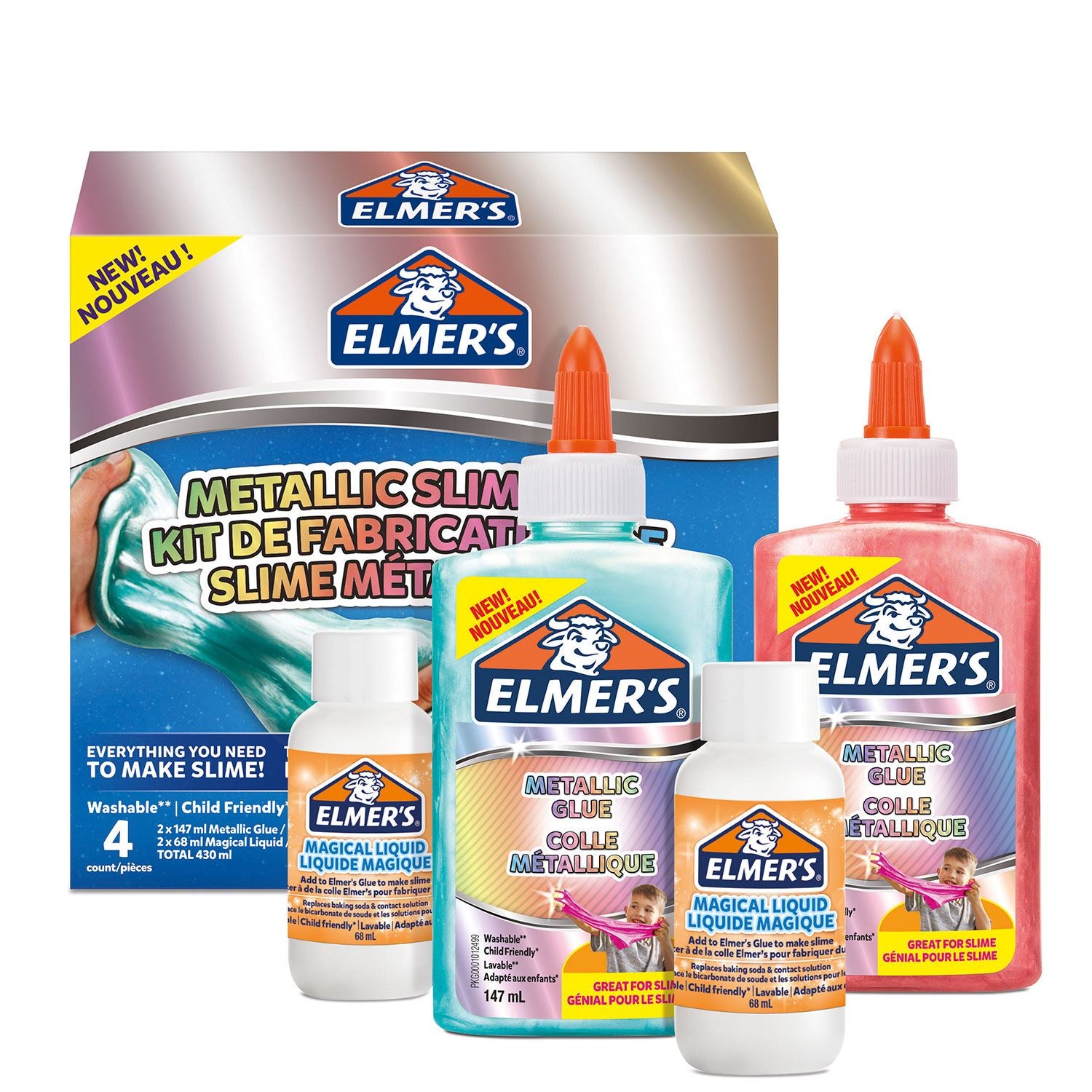 For slime that shimmers and glistens, try the Elmers Metallic Slime Kit This complete kit includes 1 bottle each of metallic glue in teal and pink, plus 2 bottles of Elmers Magical Liquid, a glue slime activator that's a less messy substitute for contact lens solution and baking soda. Washable and child-friendly, Elmer's PVA glue and Magical Liquid are an easy, mess-free way to get creative. Not suitable for children under 3 years.