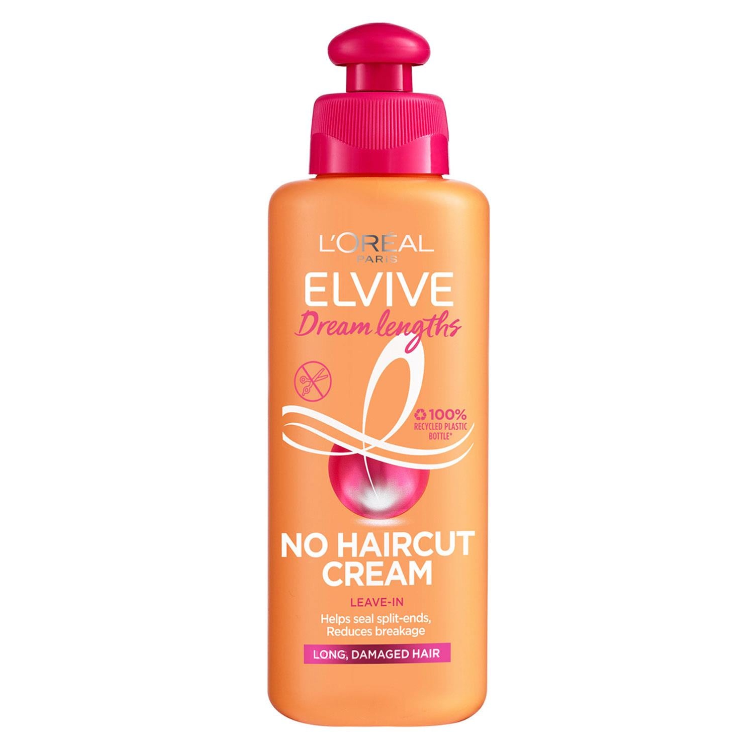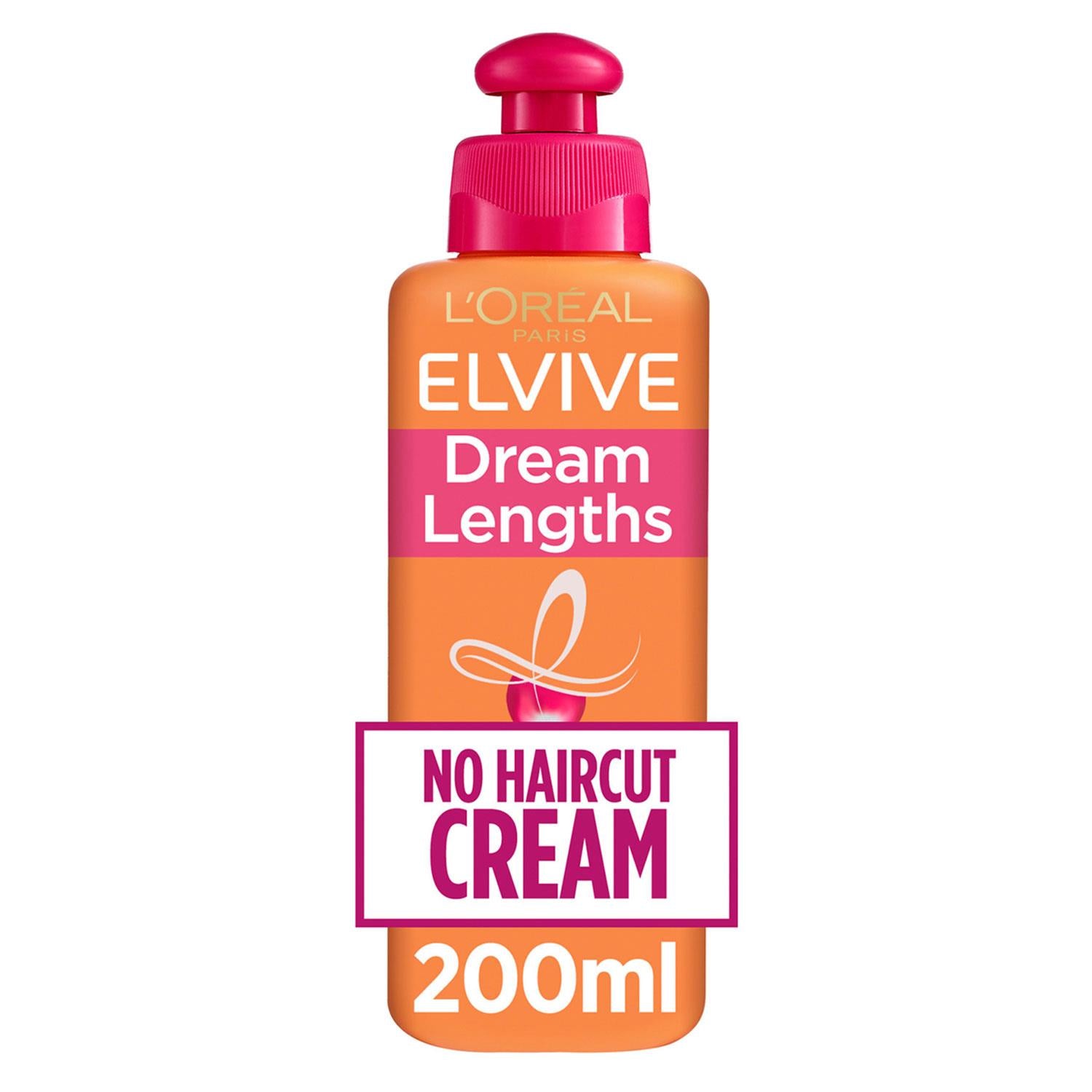 L'Oreal Elvive Dream Lengths No Haircut Cream Damaged Hair Keratin 200ml Does the appearance of split ends and hair breakage make you feel like you need a haircut? Discover the Elvive Dream Lengths No Haircut Cream. Its conditioning formula is enriched with a cocktail of Keratin, Vitamins, and Castor Oil. It helps to reduce the appearance of split ends and reduce breakage from brushing. Reinforce your long, damaged hair with Elvive Dream Lengths: The longer your hair gets, the more it goes through and the more damaged it becomes. Split ends appear and you feel like you need to trim your tips. Reinforce your long lengths with the help of the Elvive Dream Lengths range. Try the restoring shampoo, conditioner, and mask. The leave-in treatment is enriched with Keratin, Vitamins, and Castor Oil. , Helps to reduce split ends and hair breakage: The reinforcing formula helps to reduce the appearance of split ends and reduce breakage from brushing, Apply before using heat appliances to protect your hair up to 180�C protection. How to use: Squeeze the bottle and rub the cream between the palms of your hands. Apply evenly through the lengths and ends of wet or dry hair. Ingredients: 1199552,Aqua / Water,Cyclopentasiloxane,Propylene Glycol,Niacinamide,Ricinus Communis Seed Oil / Castor Seed Oil,Hydroxypropyl Guar,Hydrolyzed Corn Protein,Hydrolyzed Soy Protein,Hydrolyzed Wheat Protein,Hydroxycitronellal,Hydroxypropyltrimonium Hydrolyzed Wheat ,Protein,Phenoxyethanol,PEG/PPG-17/18 Dimethicone,Behentrimonium Chloride,Triethanolamine,Trideceth-6,Polyquaternium-4,Dimethiconol,Limonene,Panthenol,Benzyl Salicylate,Linalool,Benzyl Alcohol,Amodimethicone,Isopropyl Alcohol,Caprylyl Glycol,Alpha-Isomethyl Ionone,Carbomer,Geraniol,Potato Starch Modified,Citronellol,Cetrimonium ChlorideCoumarin,Hexyl Cinnamal,Parfum / Fragrance,(F.I.L. C212631/1) Box Contains: L'Oreal Elvive Dream Lengths No Haircut Cream Damaged Hair Keratin 200ml