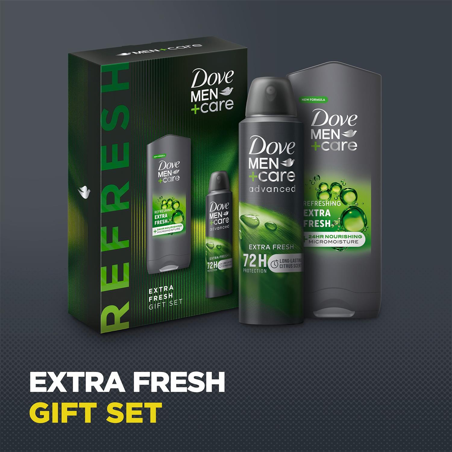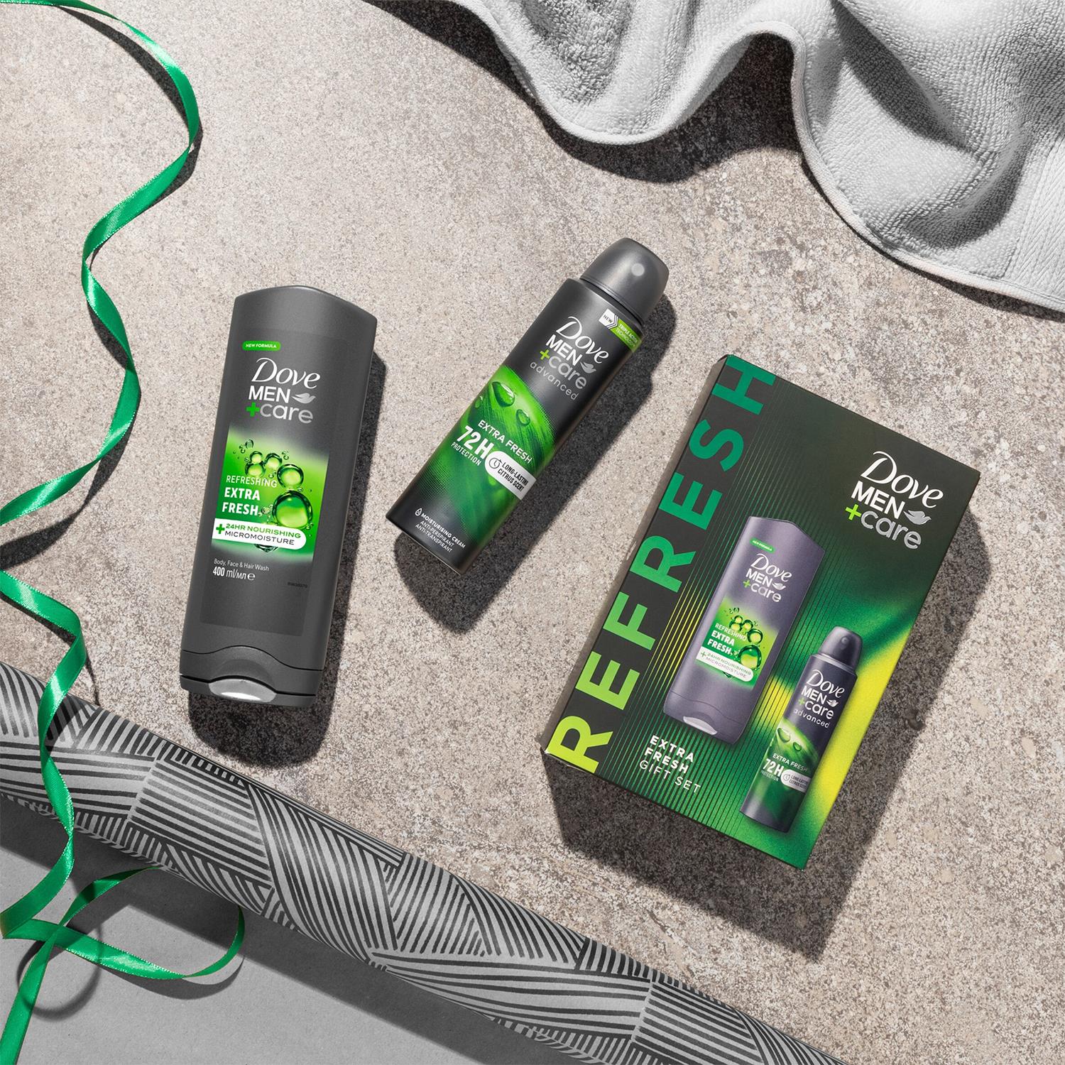 Looking for something special for a man who likes to take great care of himself? Gift him a double dose of freshness, confidence and care with the Dove Men+Care Extra Fresh Gift Set. Because we believe that care makes a man stronger, this set of gifts for him features a full-size Dove Men+Care Refreshing Extra Fresh 3-in-1 Hair, Face & Body Wash, and Dove Men+Care Extra Fresh Anti-Perspirant Deodorant Aerosol to keep him feeling comfortable and protected all day long. Not only does the body wash leave him feeling refreshed and re-energised with an invigorating and masculine scent, but it also gives him healthier, smoother skin after just one shower thanks to 24-hour MicroMoisture technology, providing continuous nourishment throughout the day. The antiperspirant deodorant spray delivers up to 72 hours of powerful odour and sweat protection, helping him stay dry no matter how hard he pushes himself. Tough on sweat, not on skin, it features a long-lasting citrus fragrance to keep him smelling good all day long and beyond. Packaged in a ready-to-give box, this set makes a perfect all-year-round gift that provides the care he needs to feel confident and strong. Our gift sets are engineered for men, so you know he’ll have comfortable, cared-for skin that’s reliably fresh all day. Help him feel his best no matter the occasion with Dove Men+Care.