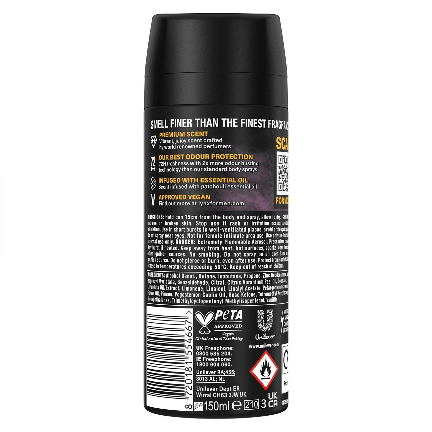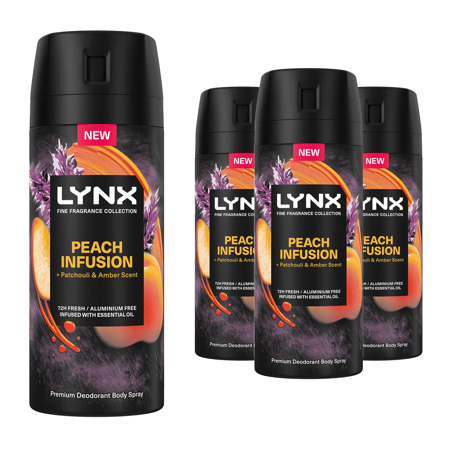 Smell finer than the finest fragrances with the LYNX Fine Fragrance Collection. Everyone deserves a hype man, so we?ve made one in fragrance form. Our world-renowned perfumers have crafted the Peach Infusion Premium Deodorant Body Spray with a vibrant, juicy peach, patchouli and amber scent infused with patchouli essential oil. With just a few spritzes of this men?s deodorant spray, you?ll have 72 hours of freshness and unbeatable confidence. We?re out here working smarter, not harder, with an aluminium-free formula that boasts 2x more odour-busting zinc technology than our standard body sprays. Vibing with this body spray for men? LYNX Peach Infusion is also available as a body wash and deodorant stick to keep you feeling fresh and ready for whatever the day brings. This deodorant spray is PETA-Approved Vegan and comes in an infinitely recyclable can. By 2025, LYNX aims for all our packaging to be recyclable or to include recycled materials. Be sure to also check out the other LYNX Fine Fragrance body sprays ? Cherry Spritz, Cocoa Velvet, Watermelon Freeze and Purple Patchouli, each smelling finer than the finest fragrances. Welcome to the future. It smells amazing. LYNX. Features: Smell finer than the finest fragrances with LYNX Fine Fragrance Collection Peach Infusion Premium Deodorant Body Spray The perfect hybrid between a fine fragrance and a deodorant, delivering 72 hours of freshness with 2x more odour-busting zinc technology than our standard body sprays Infused with patchouli essential oil, this aluminium-free deodorant for men has a vibrant peach, patchouli and amber scent crafted by world-renowned perfumers For unbeatable confidence, shake the men?s deodorant can and spray that juicy freshness across your chest Our deodorant spray is PETA-Approved Vegan and comes in an infinitely recyclable can Loving this body spray for men? LYNX Peach Infusion is also available as a body wash and deodorant stick How to Use: Shake well, then spray in short bursts in a well-ventilated area, holding the can 15 cm away from your chest. ;INGREDIENTS: Alcohol Denat., Butane, Isobutane, Propane, Zinc Neodecanoate, Parfum, Isopropyl Myristate, Benzaldehyde, Citral, Citrus Aurantium Peel Oil, Coumarin, Lavandula Oil/Extract, Limonene, Linalool, Linalyl Acetate, Pelargonium Graveolens Flower Oil, Pinene, Pogostemon Cablin Oil, Rose Ketone, Tetramethyl Acetyloctahydronaphthalenes, Trimethylcyclopentenyl Methylisopentenol, Vanillin. Safety Warnings: Avoid contact with eyes and broken skin.