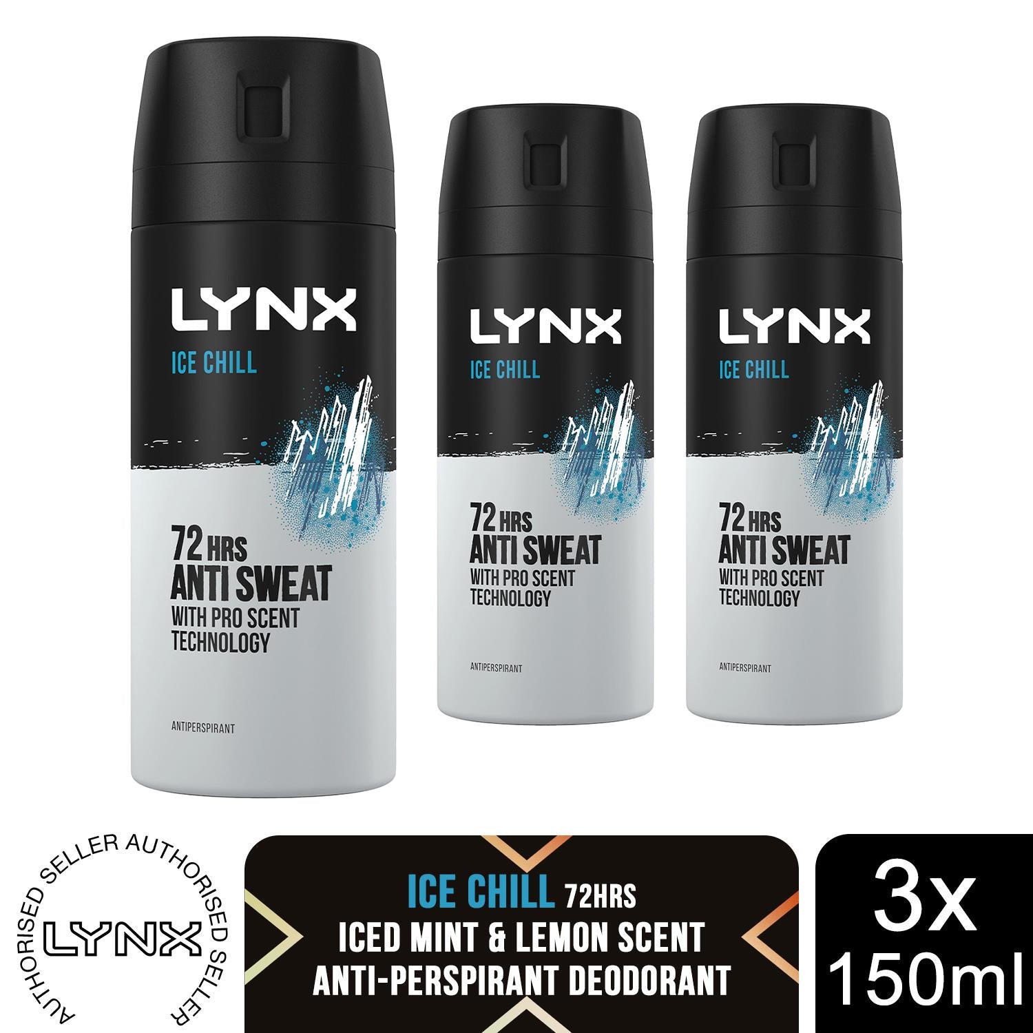 Lynx Ice Chill Anti-Perspirant Aerosol Deodorant Spray 72H Protection 150ml, 3 Pack Dive into the frosty freshness and set your senses tingling with LYNX Ice Chill XXL Anti-Perspirant Aerosol Deodorant Spray. You never know what's around the corner. Or who. Featuring the refreshing, zesty scent of iced mint and lemon, and a 72-hour anti-sweat formula, you get long-lasting protection against wetness before it starts to keep your underarms superdry. Be unsweatable. Be unstoppable. This anti-perspirant deodorant for men also gives you 72 hours of odour protection with our revolutionary dual-action pro-scent technology, keeping you smelling awesome and feeling chill, all day. So, no matter the circumstances, you can rest easy knowing you're 100% ready. You've got ice in your veins and the attitude to take it on. LYNX Ice Chill is also available as a body spray and body wash. Same classic scent, fresh new look: this great-smelling LYNX deodorant aerosol comes in an infinitely recyclable can - please, do your part and recycle. By 2025, LYNX aims for all our packaging to be recyclable or to include recycled materials. Welcome to the future. It smells amazing. LYNX. Features: LYNX Ice Chill Anti-Perspirant Aerosol Deodorant Spray delivers the perfect amount of zing with a frozen mint and zesty lemon scent LYNX anti-perspirant spray gives you 72 hours of protection, guaranteeing dryness no matter what comes your way A no-fuss anti-perspirant deodorant spray to up your freshness - and your confidence This aerosol has the same exhilarating LYNX Ice Chill fragrance with a fresh new look Pro-scent technology with an anti-sweat formula means this men's deodorant spray effectively combats wetness and provides a 100% amazing fragrance Great-smelling LYNX deodorant spray comes in an infinitely recyclable can - fresher you, cleaner planet How to Use: Shake well, hold can 15cm from the underarm and spray. Ingredients: Butane, Isobutane, Propane, Cyclopentasiloxane, Aluminum Sesquichlorohydrate, Parfum, PPG-14 Butyl Ether, Glycine, Disteardimonium Hectorite, Calcium Chloride, BHT, Propylene Carbonate, Dimethiconol, Citral, Coumarin, Geraniol, Limonene, Linalool. Box Contains: 3x Lynx Ice Chill Anti-Perspirant Deodorant, 150ml