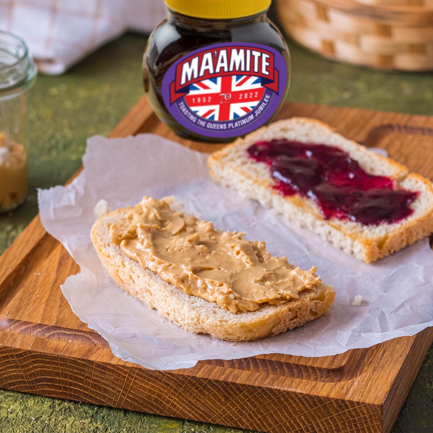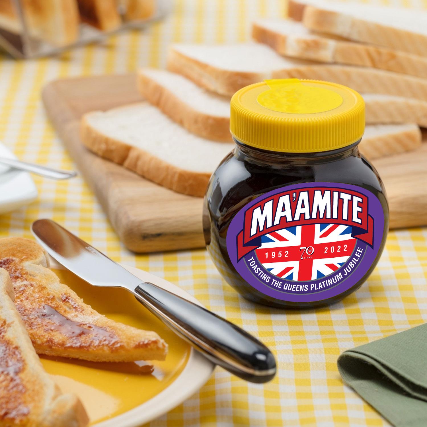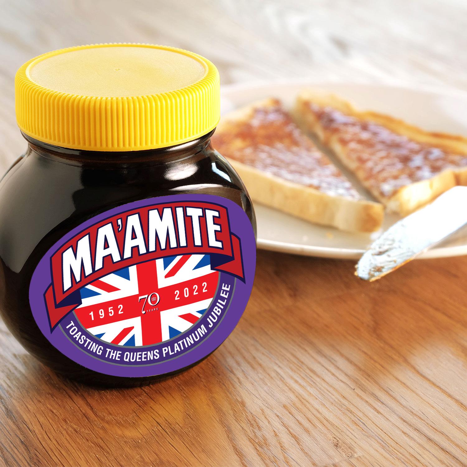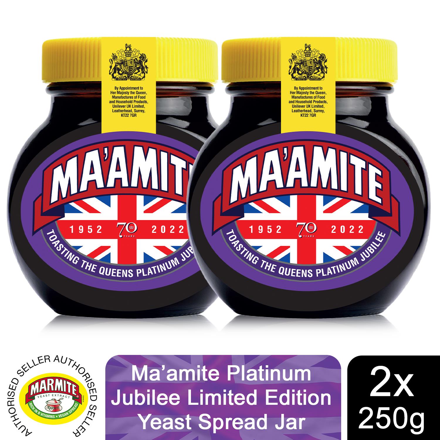Ma'amite Queen's Platinum Jubilee LimitedEdition Marmite Yeast Spread,2Jarsx250g Love it or hate it spread brand Marmite is celebrating the Queen’s upcoming Diamond Jubilee with the launch of a limited-edition jar of the famous treat – Ma’amite. Featuring a Union Jack anchored by the familiar Marmite logo the one-off venture coincides with the brand's 110th anniversary. Marmite yeast extract spreads easily on toast, providing a quick & simple breakfast solution for the whole family to enjoy. What’s more, Marmite is rich in B vitamins and has no added sugar - what more could you want from a breakfast?! Spread Marmite on toast, crumpets, bagels and a host of other foods. You can even try Marmite with eggs, avocados or cheese for an extra burst of flavour! For a quick Jubilee snack, you can’t beat a hot melted cheese and marmite panini. If you are out and about for the Jubilee weekend head for Costa Coffee as they serve yummy ones with your favourite coffee! Features: Limited Diamond Jubilee Edition Delicious Spread thinly on toast 100% Vegetarian & Vegan Low in Sugar & Fat With Extra Folic Acid Rich in B Vitamins Ingredients: yeast extract (contains BARLEY, WHEAT, OATS, RYE), salt, vegetable juice concentrate, vitamins (thiamin, riboflavin, niacin, vitamin B12 and folic acid), natural flavouring (contains CELERY) Allergens: including Cereals containing Gluten Storage: Do not refrigerate Package Contains: Ma'amite Jubilee Limited Edition Yeast Spread Jar, 250g
