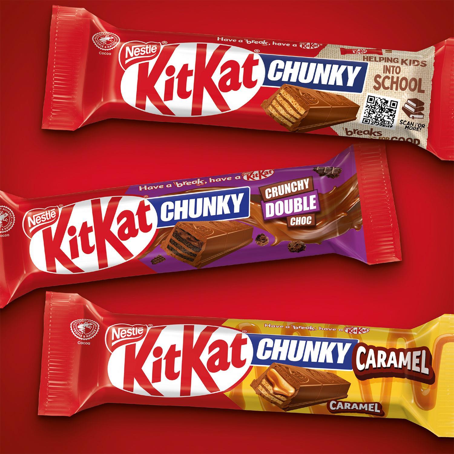 Nestle Chocolate Bar, KitKat Chunky Milk Chocolate Bar 24x40g (2 Pack) Unwrap, snap off a chunk and enjoy the delicious smooth milk chocolate and crispy wafer of KITKAT Chunky. With its perfect chocolate-to-wafer ratio, KITKAT is the perfect companion for any break. KITKAT Chunky launched in 1999 and is the biggest innovation for KITKAT since its launch in 1935. You can choose from the classic KITKAT Chunky Milk or mix your break up and pick up a KITKAT Chunky Peanut Butter or KITKAT Chunky Caramel. If you want an even bigger break, go for KITKAT Chunky Duo. Features: A delicious chocolate bar, comprising a crispy wafer covered with a tasty layer of milk chocolate A great treat when you're enjoying a break, a KITKAT with a bit more bite! No artificial colours, flavours or preservatives Suitable for vegetarians Ingredients: Sugar, WHEAT Flour (contains Calcium, Iron, Thiamin and Niacin), Whole MILK Powder, Cocoa Mass, Cocoa Butter, Vegetable Fats (Palm, Shea, Sal), Whey Powder Product (MILK), Skimmed MILK Powder, Emulsifier (Lecithins), Yeast, Raising Agent (Sodium Bicarbonate), Glucose Syrup, Butterfat (MILK), Whey Powder (MILK), Natural Flavourings Allergy Advice: Milk - Contains Nuts - May Contain Peanuts - May Contain Wheat - Contains Specifics: Storage Type: Ambient Preparation and Usage: Know your servings 1 bar = 1 serving Storage: Store cool and dry Lifestyle: Suitable for Vegetarians Box Contains: 48 Pack of KitKat Chunky Milk Chocolate Bar