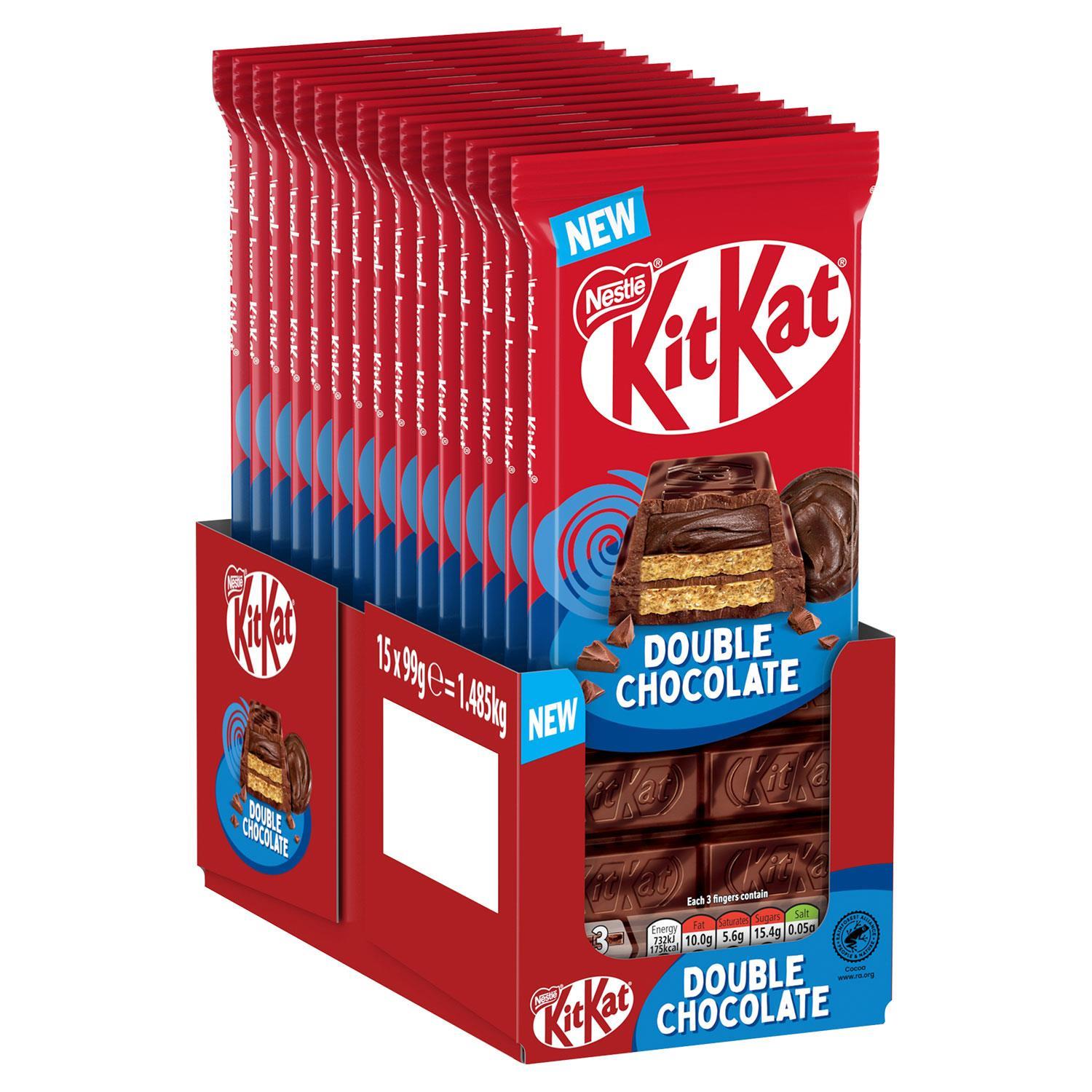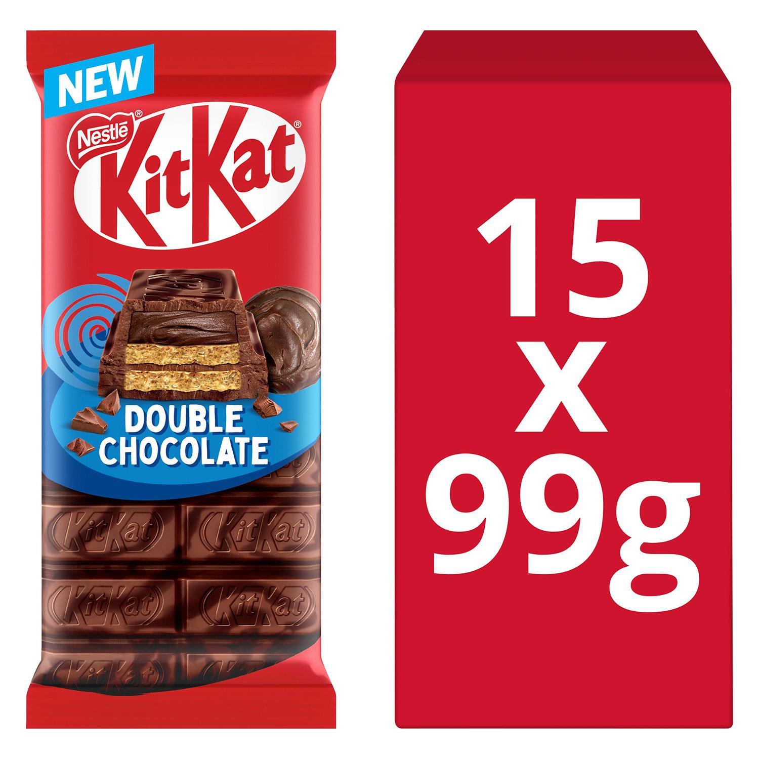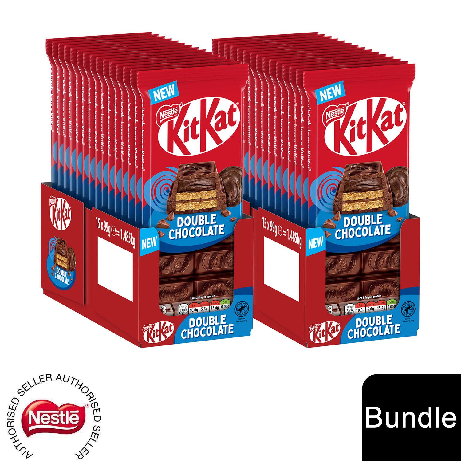 Nestle Sharing Bars, KitKat Double Chocolate 15x99g(2 Pack) KitKat Double Chocolate: Discover a delicious new way to break! Snap into a delicious NEW 99g KitKat Double Chocolate Sharing Bar with crispy KitKat wafer, cocoa flavoured filling and covered with thick, milk & dark chocolate marbled swirls. Features: Crispy KitKat wafer, cocoa flavoured filling, all covered with thick, milk & dark chocolate marbled swirls Perfect for sharing with family or friends No artificial colours, flavours or preservatives Part of the innovative 'Breaks for Good' programme Allergy Advice : Milk - Contains Nuts - May Contain Peanuts - May Contain Soya - May Contain Safety Warning: Important: Young children (less than 4 years) have limited chewing ability and could choke on small sweets. Box Contains: 30x KitKat Double Chocolate