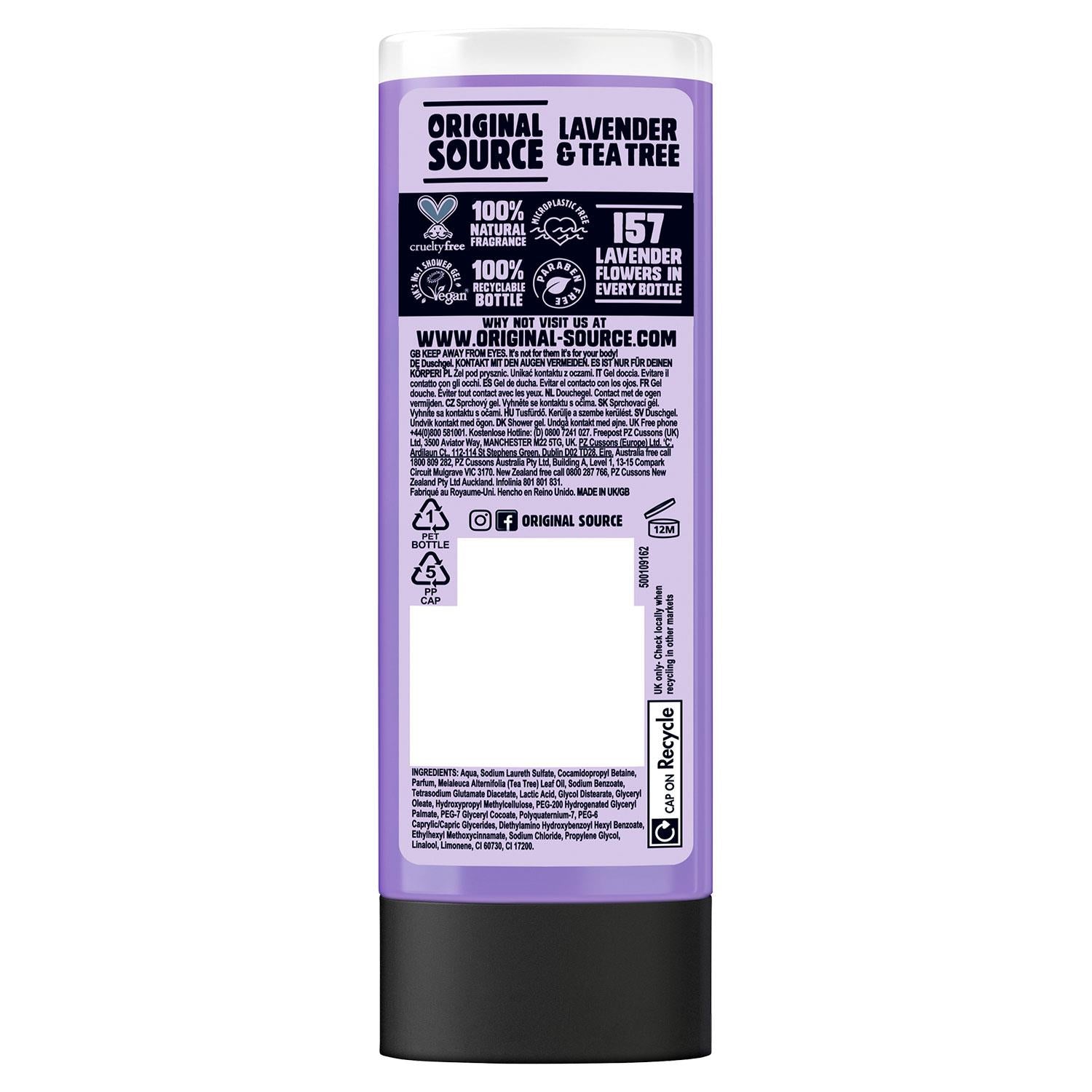 It's back! 100% natural Fragrance, 157 Lavender flowers in every bottle, microplastic and paraben free, cruelty free, suitable for vegans. Products are tested on us, never on animals, paraben free and we’re proud to be Vegan too. Original Source Shower Gel is manufactured in the UK using 100 Percent renewable energy and our bottles are 100 Percent recyclable. Enjoy your daily shower time with a sensorial hit of nature.