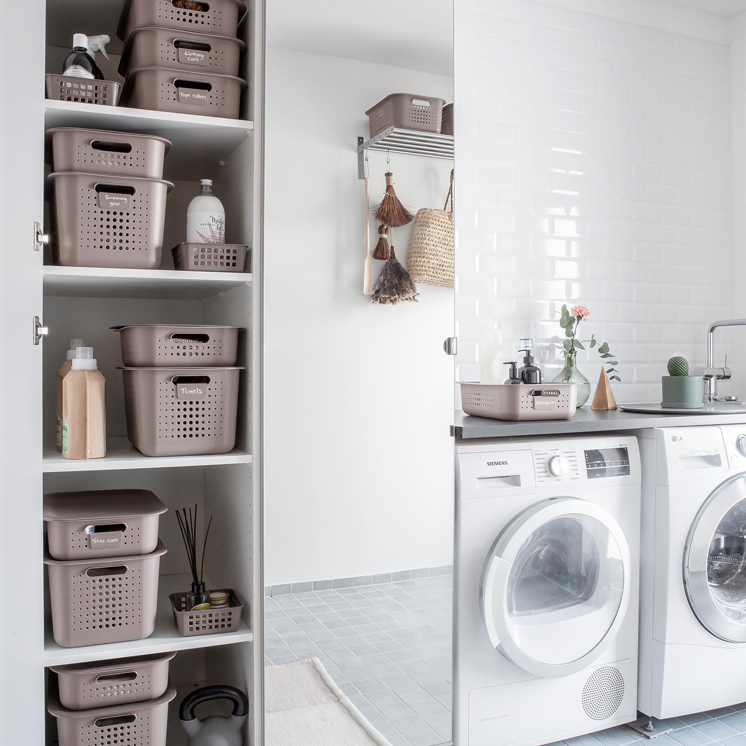 SmartStore™ Basket Recycled 15 is made from recycled plastic and comes in Taupe colour. The construction is lightweight, durable and suited for both dry and wet surfaces. The basket fits perfectly in any room of the house, and the medium size has room for various office items or clothing accessories. The series was awarded the German Design Award 2018.