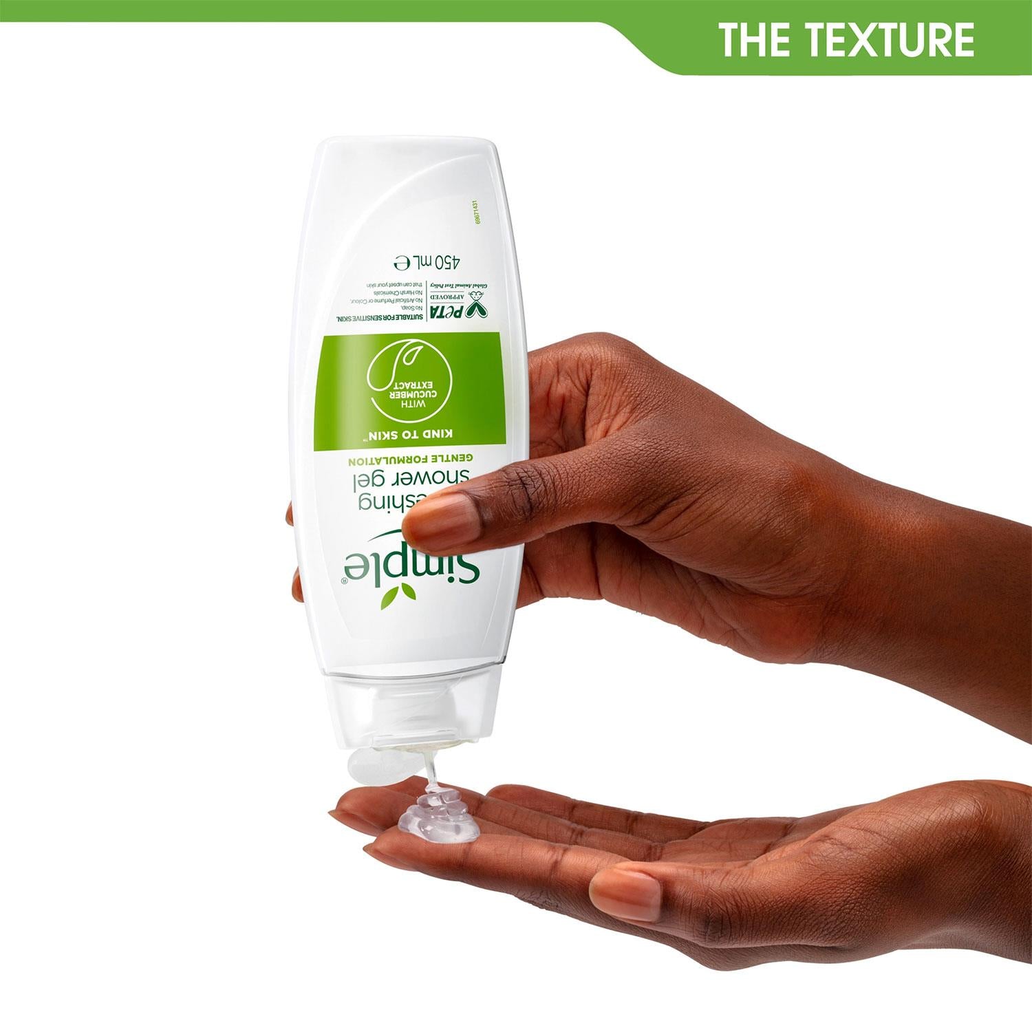 Simple Kind to Skin Refreshing Shower Gel with Gentle Formulation 450ml, 3 Pack Smile, it's simple. Simple has been the expert in sensitive skin since launching the first perfume and colour-free soap in 1960. We�ve stayed committed to our original philosophy of creating skincare and skin cleansing products suitable for all skin types. From this, we have learnt that if something is as delicate and precious as skin, it deserves only the kindest care. Choose Simple Kind to Skin Refreshing Shower Gel to clean and refresh your skin. A refreshing shower gel for dry skin with cucumber extracts and pro-vitamin B5, but no artificial perfume or colour, and no harsh chemicals that can upset your skin. Simple's luxury shower gel is a perfect blend of ingredients to awaken and revitalise your skin. This body wash has been dermatologically tested and approved, and therefore it is an excellent shower gel for dry or sensitive skin. Features: Simple Kind to Skin Refreshing Shower Gel is the perfect blend of ingredients to clean and energise your skin Simple's sensitive skin experts created a shower gel that is perfect for even the most sensitive skin Simple Refreshing Shower Gel is enriched with cucumber extracts and pro-vitamin B5 This body wash contains no artificial perfume, colour, or harsh chemicals that can upset your skin This shower gel for dry skin is dermatologically tested and approved How to Use: Squeeze our sensitive body wash onto a sponge or your hands. Gently massage over your skin to form a rich lather. Rinse thoroughly. Ingredients: Aqua, Sodium Laureth Sulfate, Sodium Chloride, Cocamidopropyl Betaine, Glycerin, Sodium Benzoate, Citric Acid, Sodium Lactate, Polyquaternium-7, Panthenol, Tetrasodium EDTA, Menthyl Lactate, Dipropylene Glycol, Propanediol, Cucumis Sativus Fruit Extract Safety Warnings: For external use only. Avoid getting into your eyes. If eye contact occurs, rinse thoroughly with water. Box Contains: 3x Simple Kind to Skin Refreshing Shower Gel, 450ml