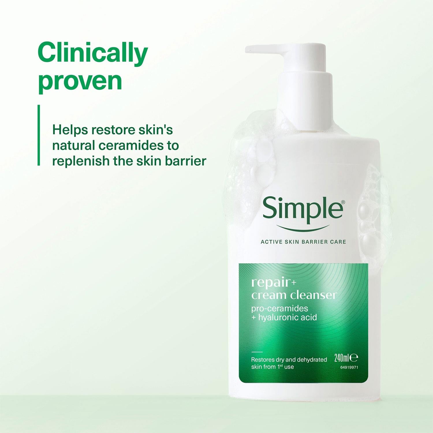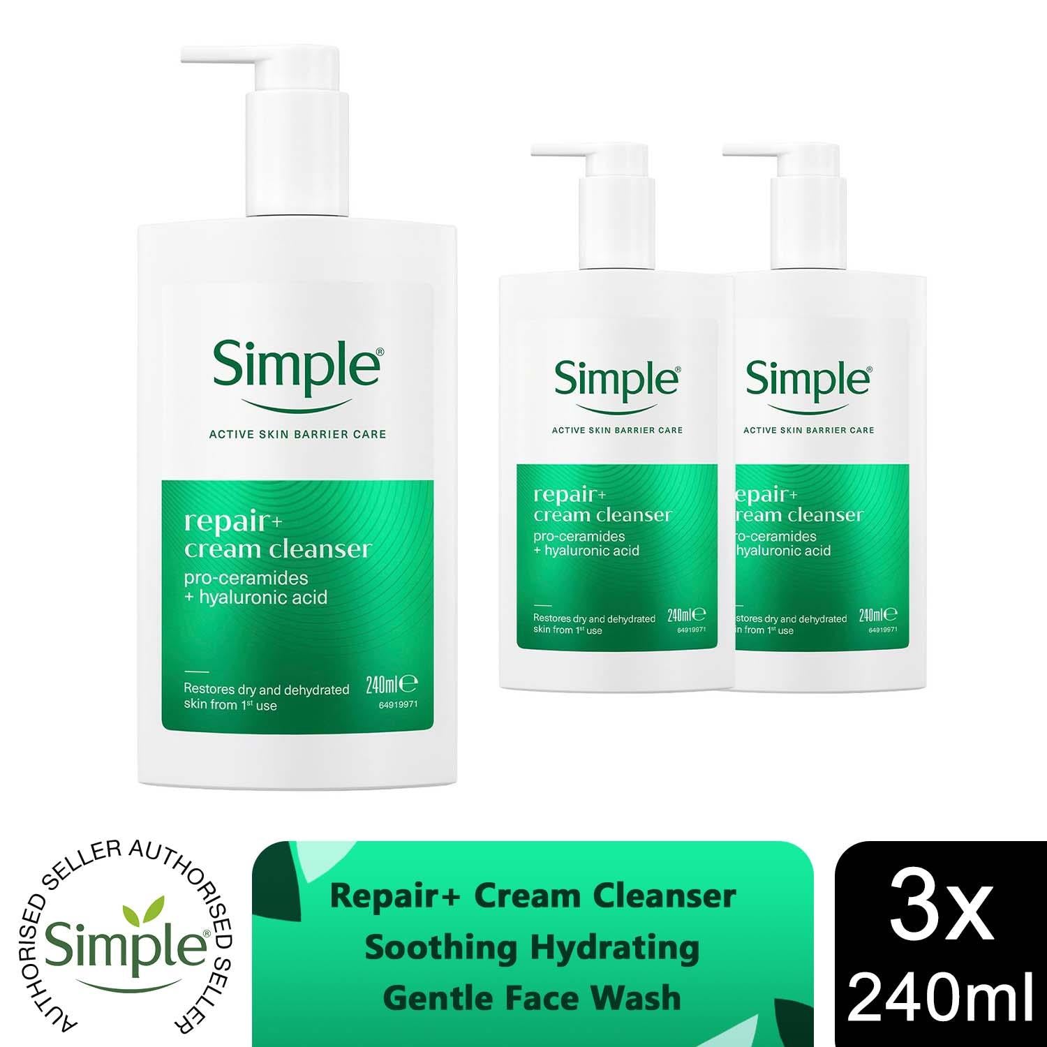 Simple Repair+ Facial Cleanser Soothing Hydrating Gentle Face Wash 240ml, 3 pack Start your skincare routine with Simple Repair+ Cream Cleanser, a gentle yet powerful face cleanser designed to restore hydration and support your skin's natural barrier. Powered by pro-ceramides, this advanced formula works with your skin's own biology to replenish its natural ceramides and reinforce the skin barrier for healthier-looking, more resilient skin. Enriched with hyaluronic acid, our facial cleanser boosts hydration, leaving your skin feeling soft, supple and deeply nourished from the first use. Features: Advanced Skin Nourishment: Simple Repair+ Cream Cleanser is powered by pro-ceramides and hyaluronic acid to deeply replenish dry and dehydrated skin For Visible Results: This deeply replenishing facial cleanser restores hydration from the first use, leaving skin visibly soft & supple. 88% of users agreed that it cleansed their skin effectively Works with Skin's Own Biology: This nourishing cleanser is formulated to replenish the skin's natural ceramides and support its barrier for healthier, more resilient skin Efficacious Textures: Our rich and creamy cleanser has a 98% biodegradable, sulphate-free formula that produces a luxurious lather, maintaining your skin's natural moisture balance Ingredients: Aqua, Glycerin, Cocamidopropyl Betaine, Sodium Methyl Lauroyl Taurate, Glycol Distearate, Sodium Chloride, Cocamide MEA, Sclerotium Gum, Sodium Benzoate, Guar Hydroxypropyltrimonium Chloride, Citric Acid, Lauric Acid, Sodium Methyltaurate, Stearic Acid, Cetrimonium Chloride, Sodium Hyaluronate, Panthenol, Sodium Hydroxide, Ceramide NG, Sodium Cocoyl Alaninate. How to use: Morning and evening, lather a small amount of Simple face cleanser in your hands and massage onto wet skin. Rinse thoroughly with water. Avoid eye area. Safety Warning: Avoid contact with eyes. For external use only. Box Contains:3 Pack of Simple Repair+ Facial Cleanser, 240ml
