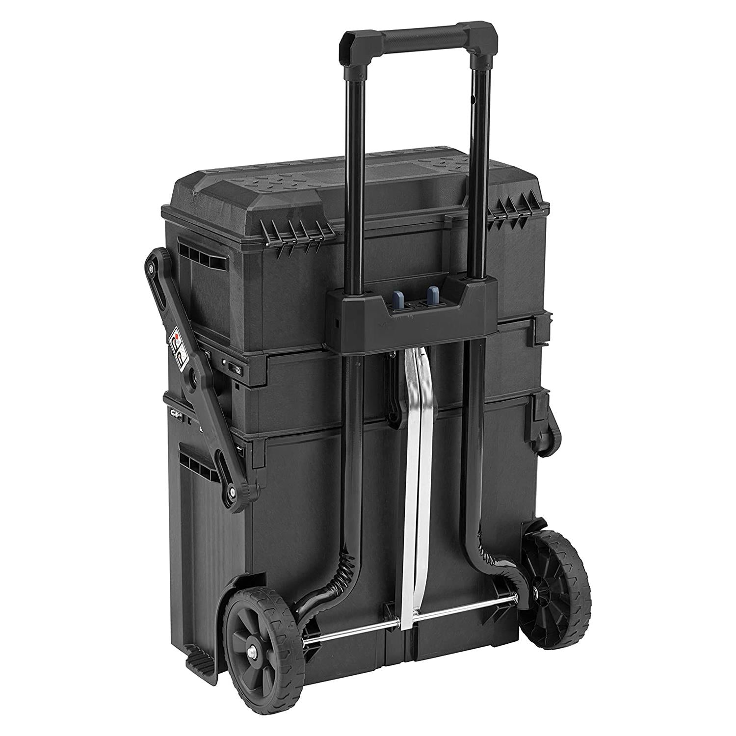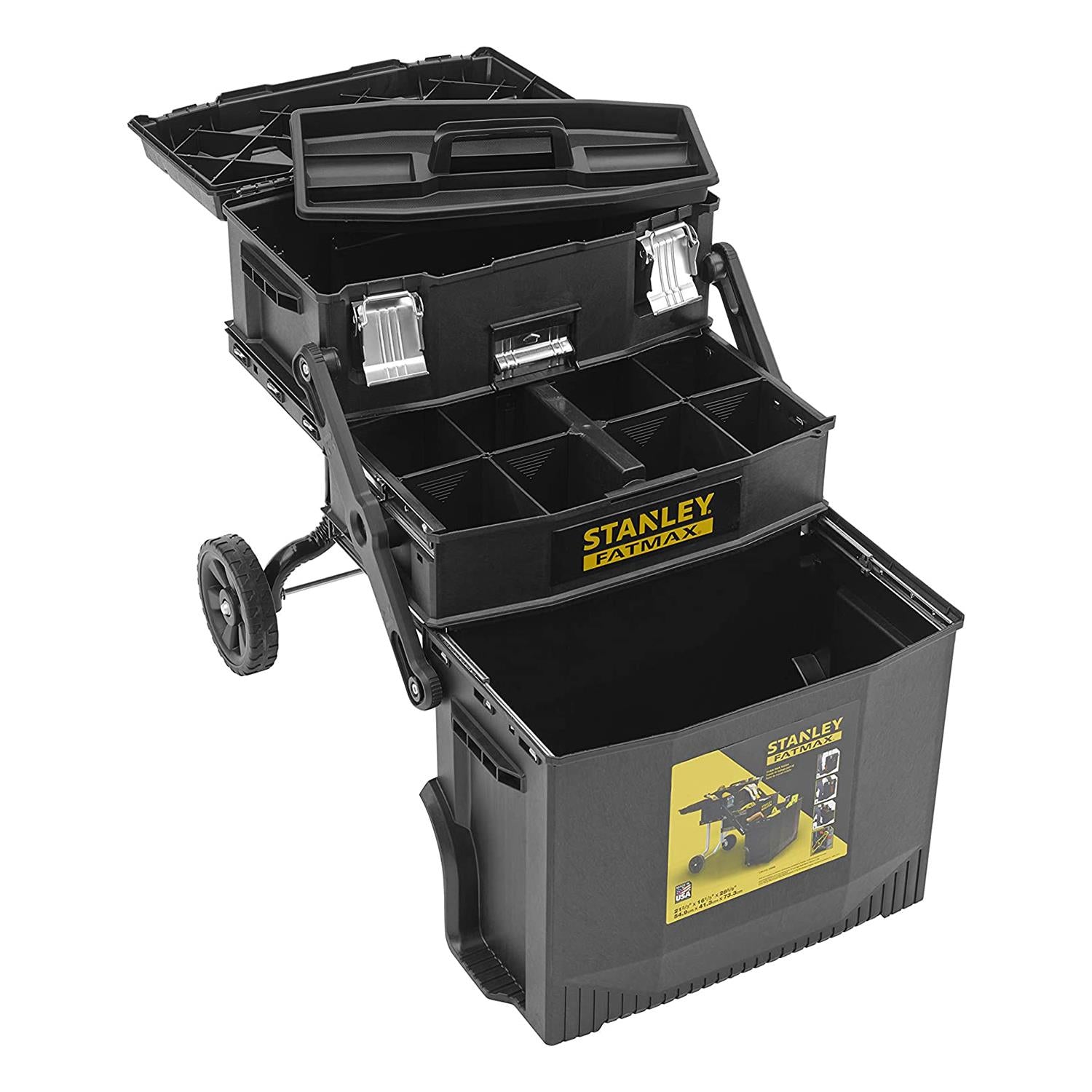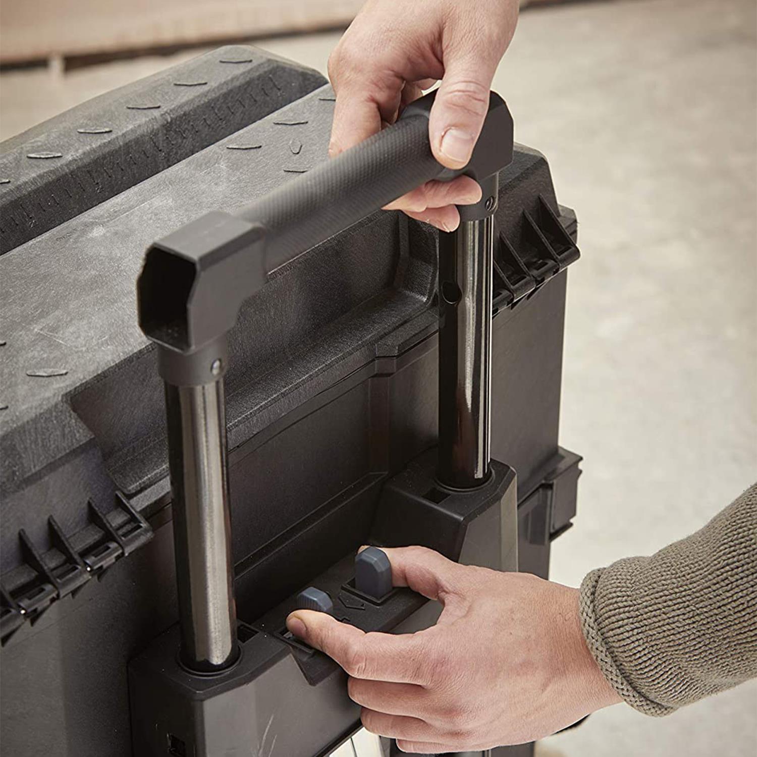 The telescopic handle provides easy manoeuvrability. It opens up easily into a 4-level workstation, with a giant lower bin, which is for bulky materials and equipment such as paint cans, large components and power tools. There is a toolbox with a lift out tray for smaller tools, which fits neatly in to the fold out lid, along with a large adjustable organiser for nails, screws and other small components.