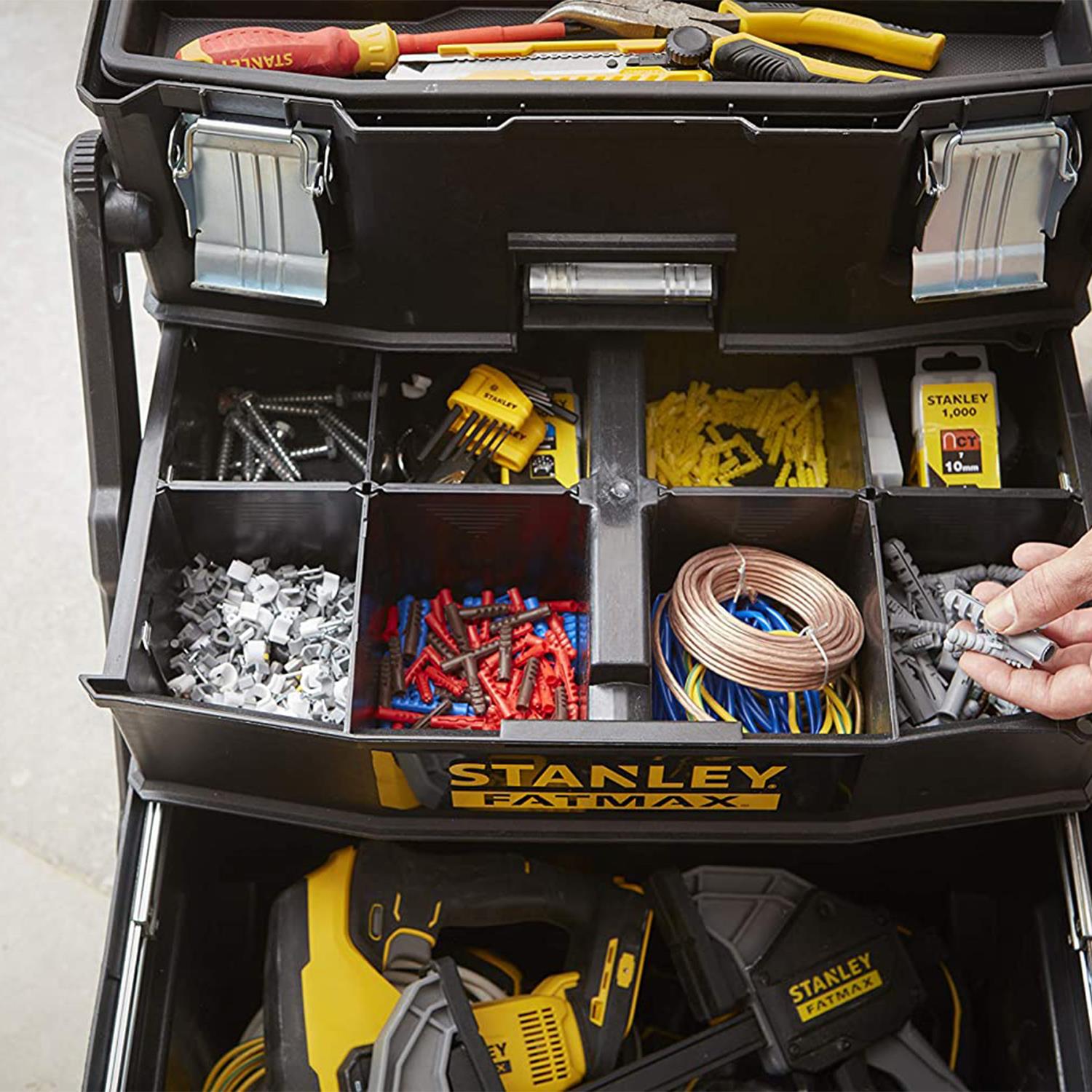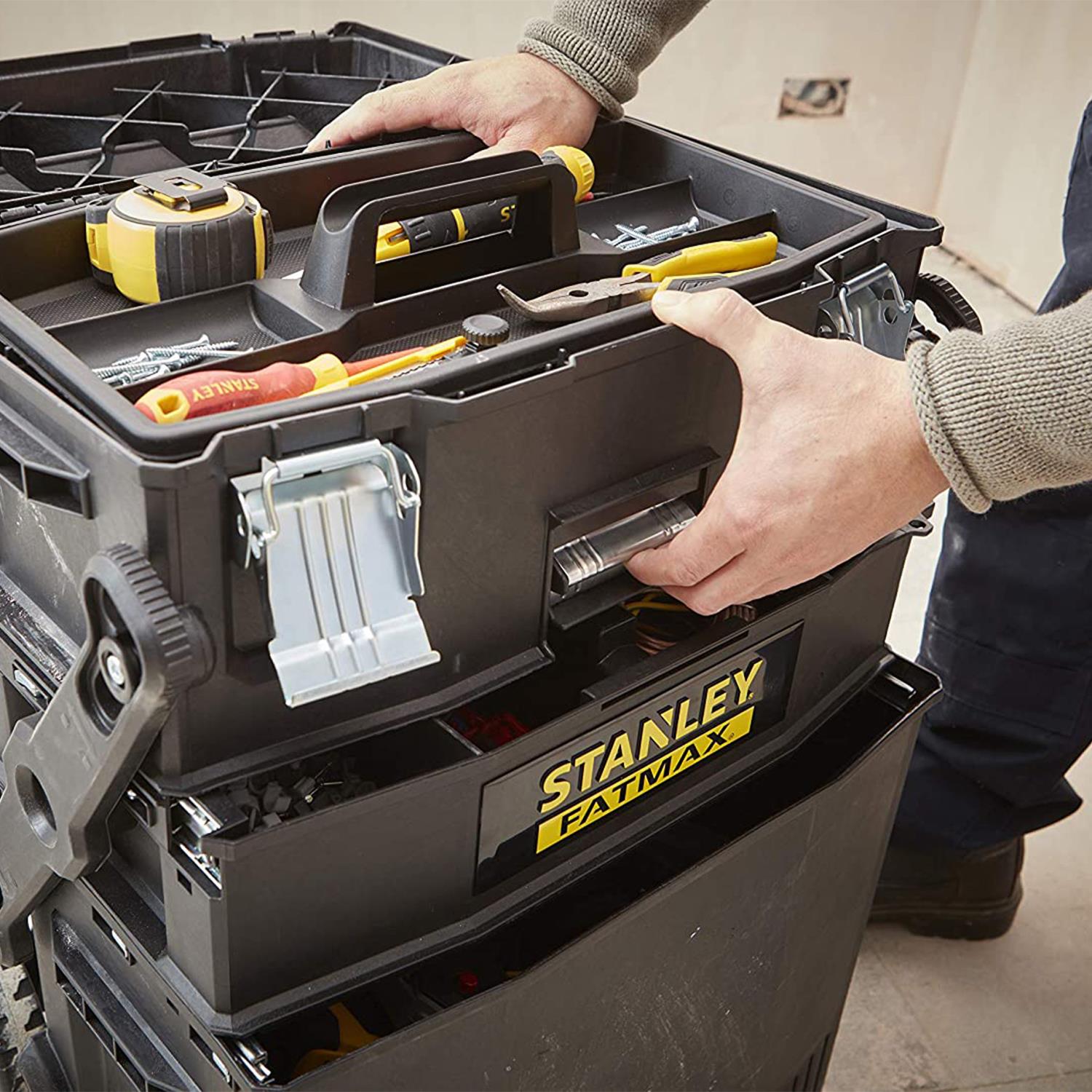 The FatMax® Cantilever Rolling Workshop is the ideal solution for tradesmen who need to transport large amounts of equipment and materials to the worksite. It saves time and effort on repeated trips to the van.