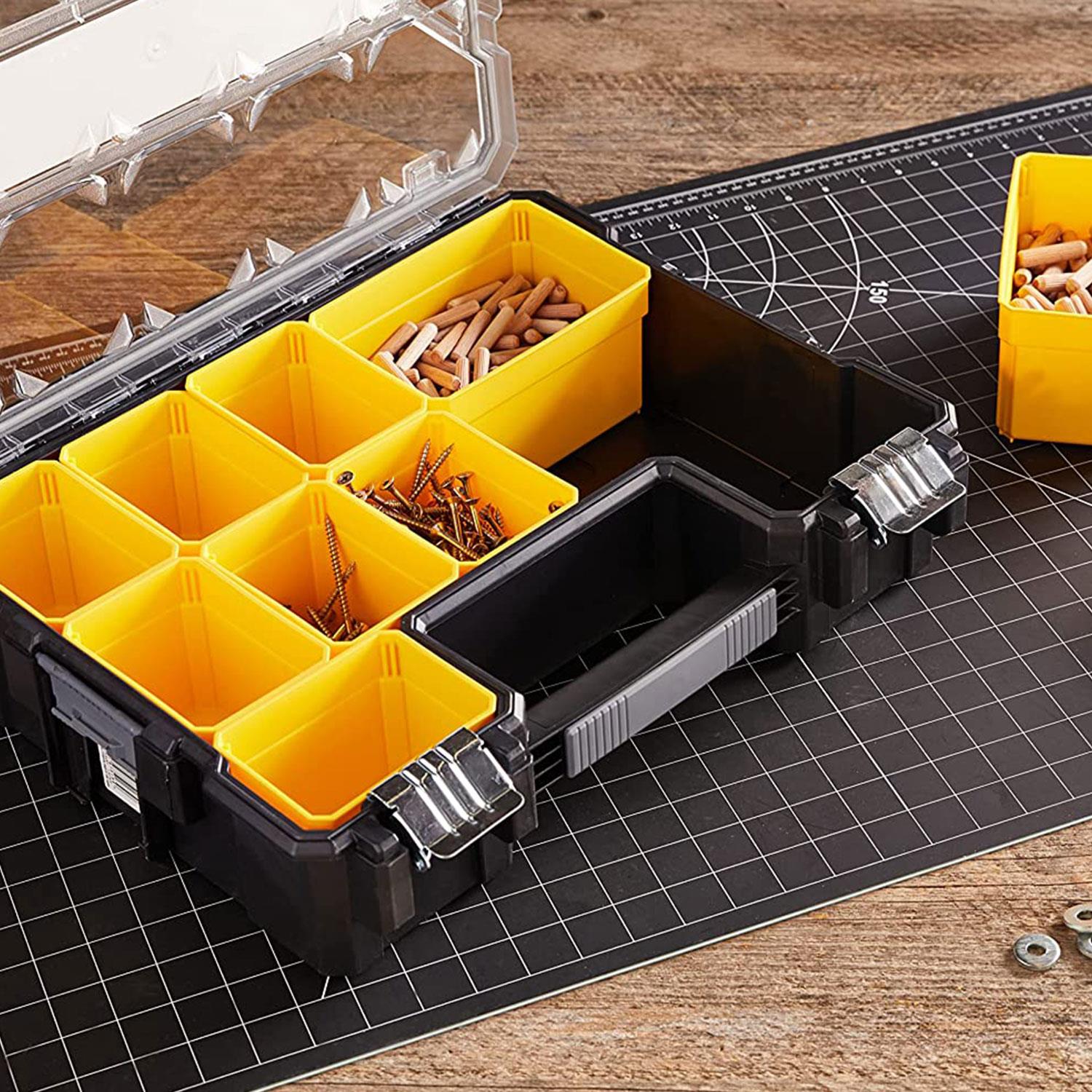 A plastic handle with textured grip allows the organiser to be moved comfortably, while the organiser's lid has been specially designed to ensure that the compartments are held securely in place and fastens with two metal latches. For added versatility, multiple organisers can be clipped together using the side latches for easy transportation.
