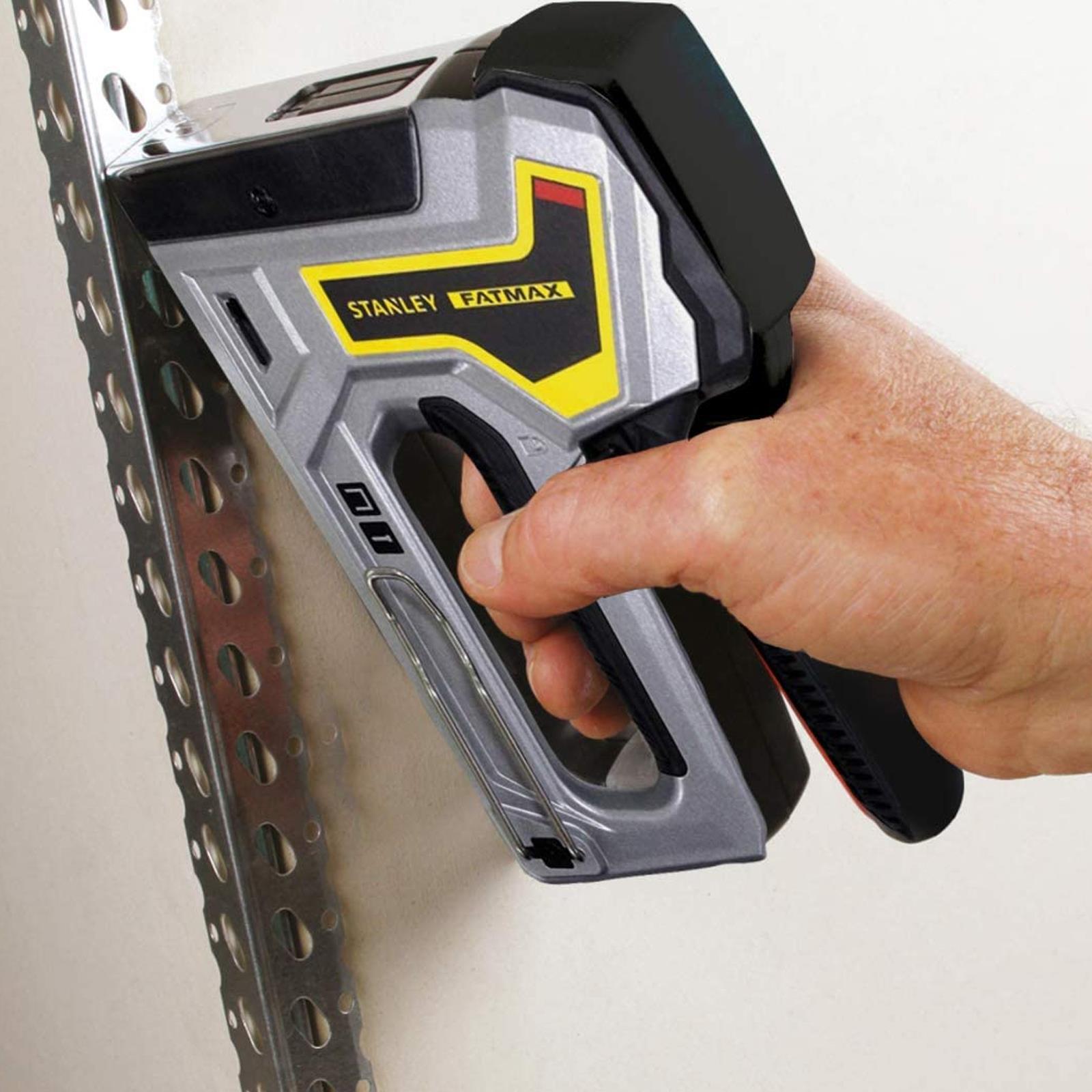 This Stanley 6 TR350 FatMax Heavy-Duty Stapler / Nailer is a heavy-duty staple and brad nail gun with aluminium housing for added durability and long-lasting usability. It is designed for use on thin woods, also sheet materials, and suitable for applications such as gardening, wire netting, insulation, beading, fencing, trim work and panelling.