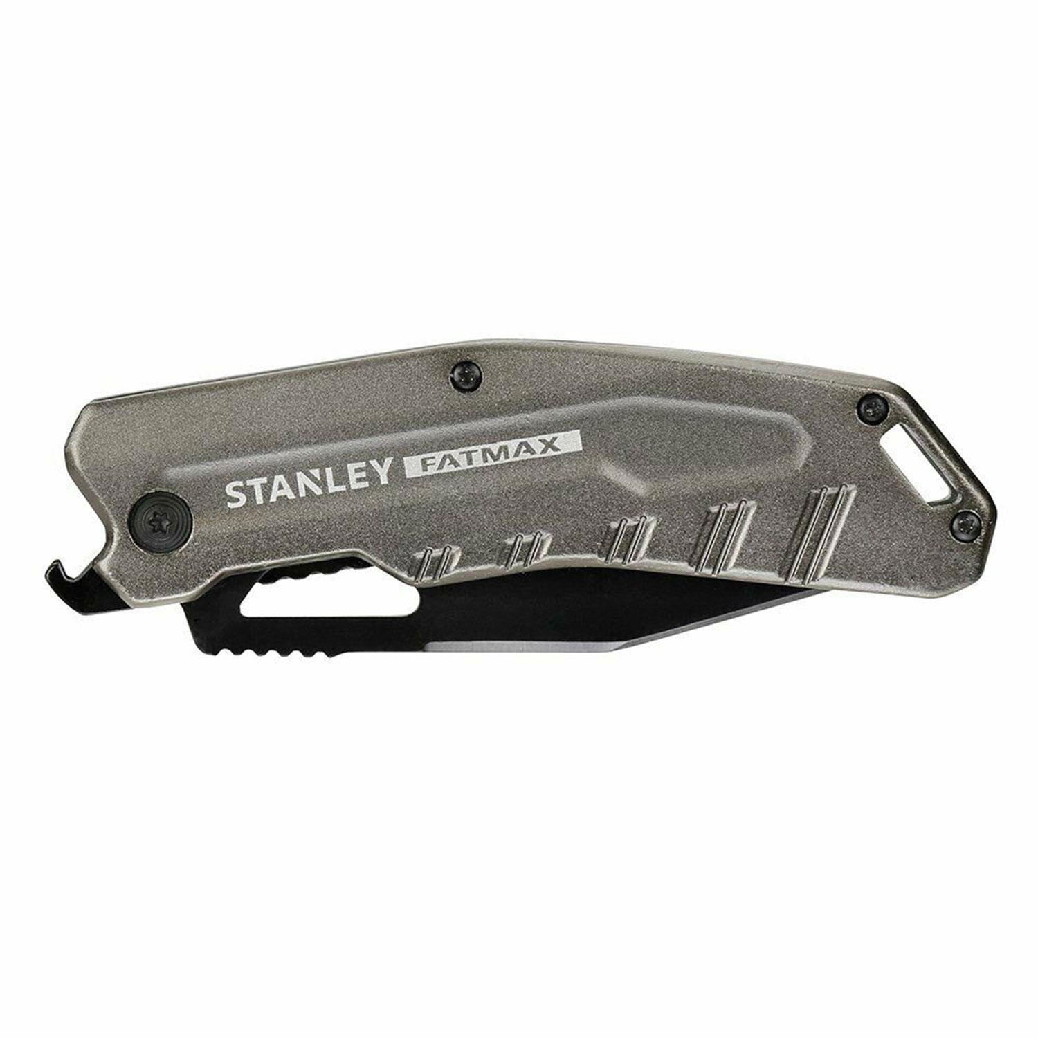 The Stanley Tools FatMax® Premium Pocket Cutting tool has a heavy-duty design with a stainless steel combination blade with both serrated and straight edges for cutting various materials. It also provides increased durability and corrosion resistance. The slim lightweight aluminium handle provides improved comfort. Other features include a tether loop for increased security and a bottle opener.