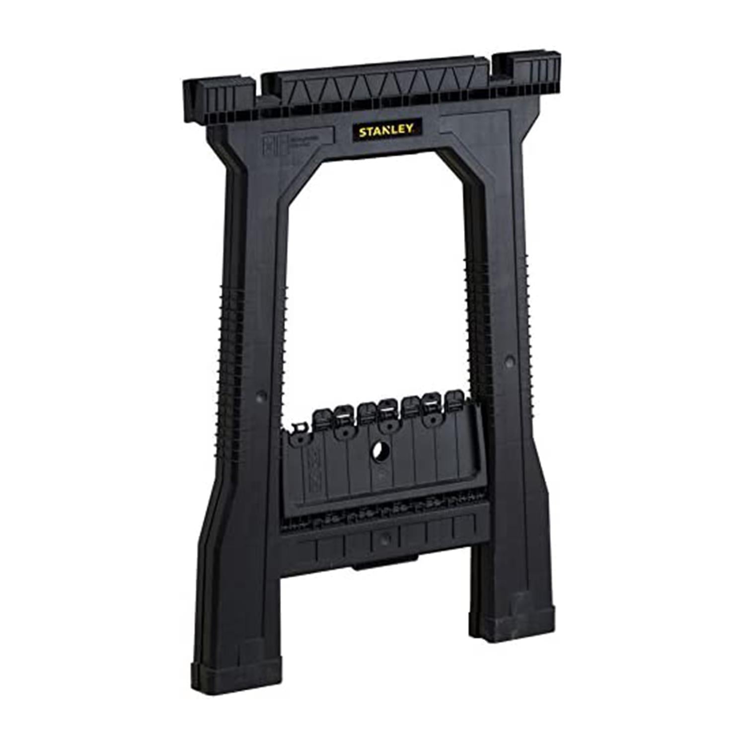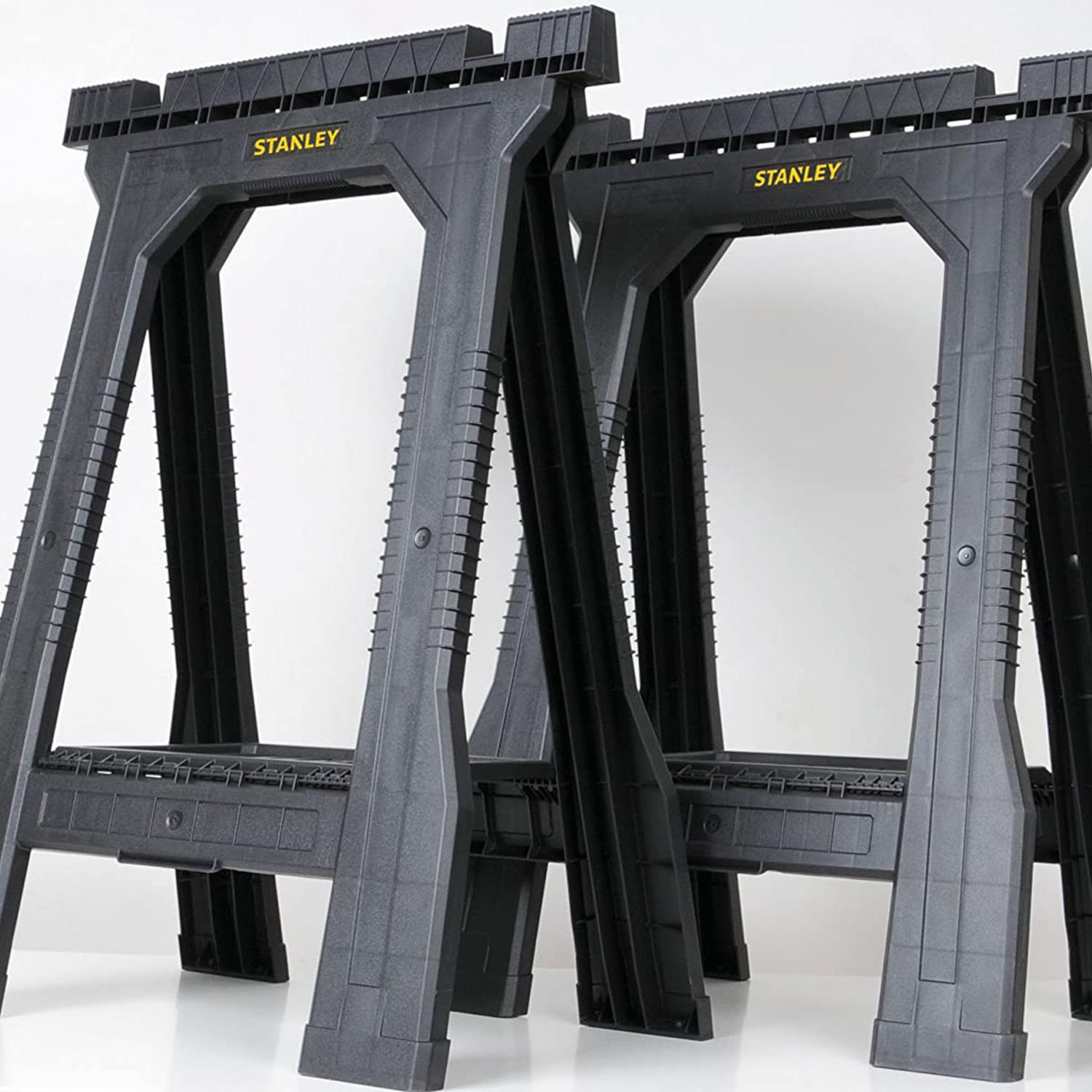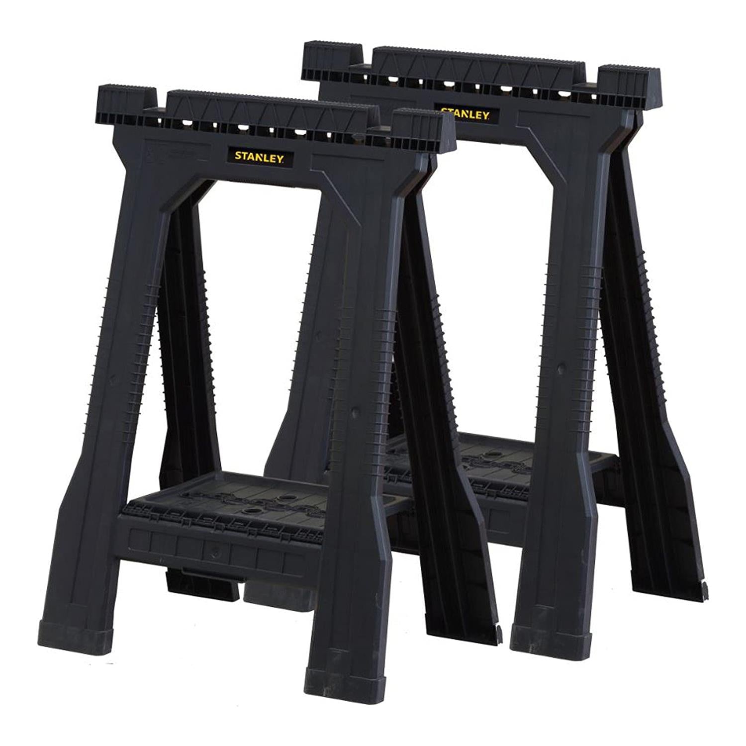 The Stanley 170355 Junior Sawhorses have an all plastic construction with Non-slip rubber inserts in the top for added grip when working on the project in hand and non-slip rubber feet for added stability and safety. The saw horses will fold flat for easy transportation and storage.
