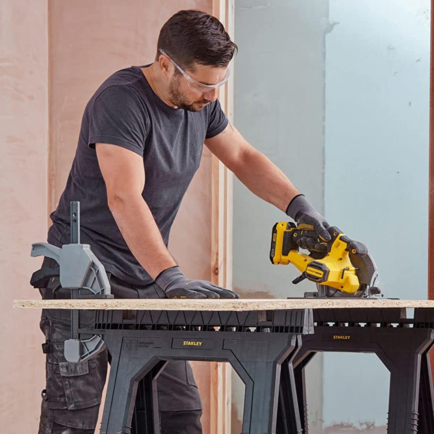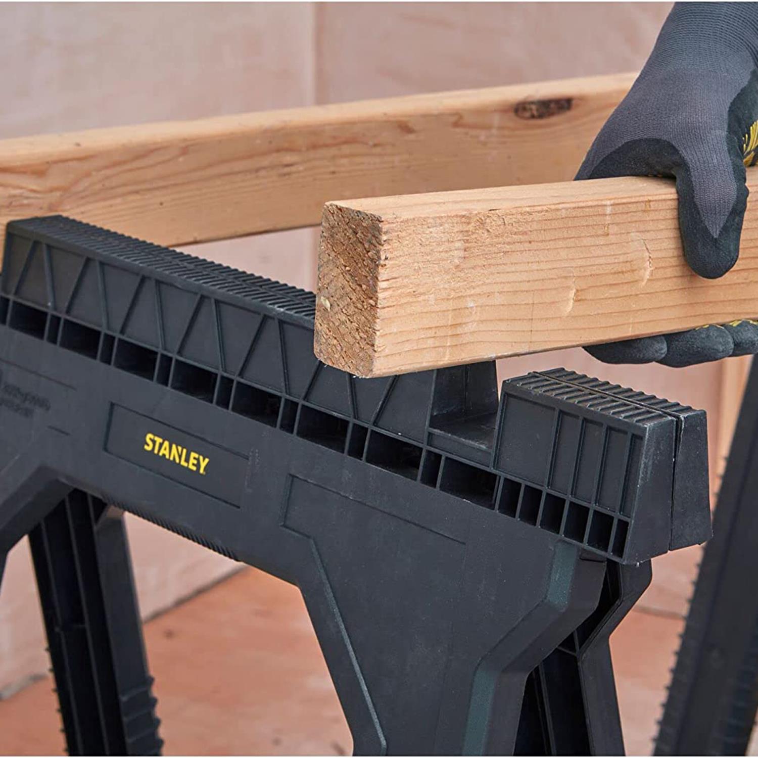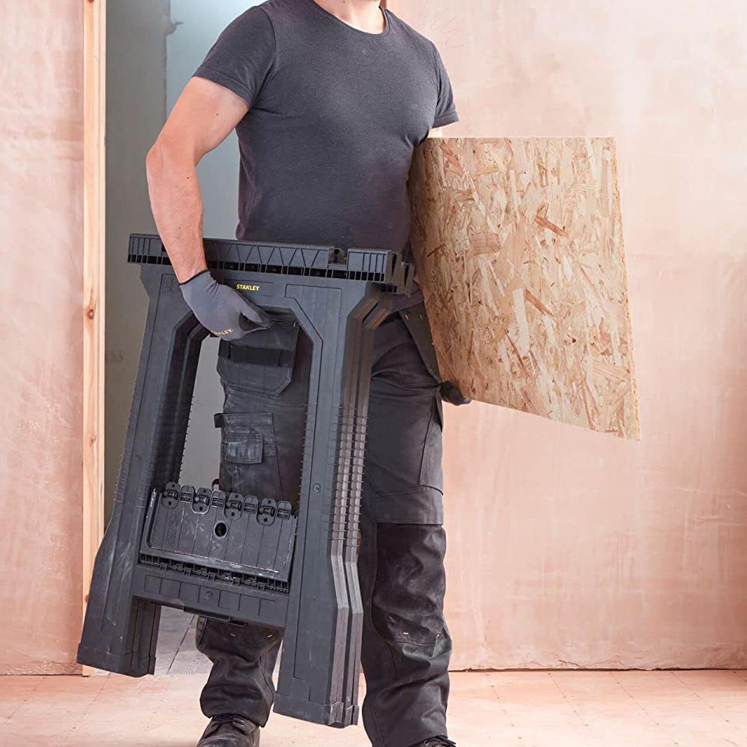 The Stanley 170355 Junior Sawhorses have an all plastic construction with Non-slip rubber inserts in the top for added grip when working on the project in hand and non-slip rubber feet for added stability and safety. The saw horses will fold flat for easy transportation and storage.