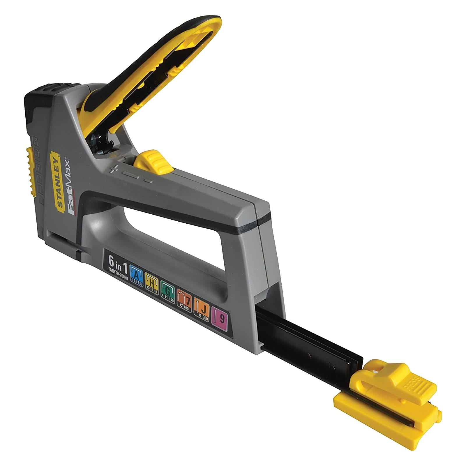 The Stanley FatMax® heavy-duty 6-in-1 Stapler TR75 is a compact, multi-purpose staple and brad nail with plastic housing, compatible with 6 types of light and heavy-duty staples and nails. Designed for applications such as home repairs, decorative works, fencing, trim work, beading, insulation, and architrave fitting. It has a high and low power setting to control intensity of staple application when working on a variety of hard and soft materials.
