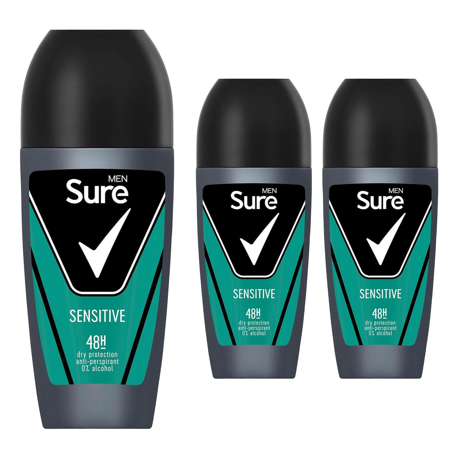 Sure Men Sensitive Antiperspirant Roll On 48H Sweat & Odour Protection 50ml, 3 Pack Every second counts, whether you�re running late or running to beat your personal best. Nothing should distract you from your focus � especially not sweat. Sure Sensitive Antiperspirant Deodorant Roll On features an alcohol-free formula that provides 48-hour protection against sweat and odour, so you can feel fresh, dry and protected all day without worrying about irritation. This antiperspirant deodorant for men uses Sure�s innovative MotionSense technology to release bursts of sandalwood, patchouli and vanilla fragrance when you need it most. Features: Sure Sensitive Antiperspirant Deodorant Roll On has been developed to give you cutting-edge protection against sweat and odour This roll-on deodorant features our unique MotionSense technology to give you an all-day sandalwood, patchouli and vanilla fragrance � the more you move, the more it protects To keep sweat and odour at bay, ensure your underarms are dry before applying the roll-on in circular motions, checking coverage is even on both underarms Get all-day freshness and 48-hour protection from sweat and odour with our antiperspirant deodorant for men This antiperspirant roll-on is alcohol-free and suitable for everyday use How to Use: Before applying, ensure underarms are dry. Roll on in circular motions, checking coverage is even on both underarms. Ingredients: Aqua, Aluminum Chlorohydrate, Glycerin, Helianthus Annuus Seed Oil, Steareth-2, Parfum, Steareth-20, Disodium EDTA, Pentaerythrityl Tetra-di-t-butyl Hydroxyhydrocinnamate, Alpha-Isomethyl Ionone, Benzyl Alcohol, Benzyl Salicylate, Citronellol, Coumarin, Eugenol, Hexyl Cinnamal, Limonene, Linalool Safety Warnings: Do not use on broken skin. Stop use if rash or irritation occurs. Box Contains: 3x Sure Men Sensitive Antiperspirant Roll On, 50ml