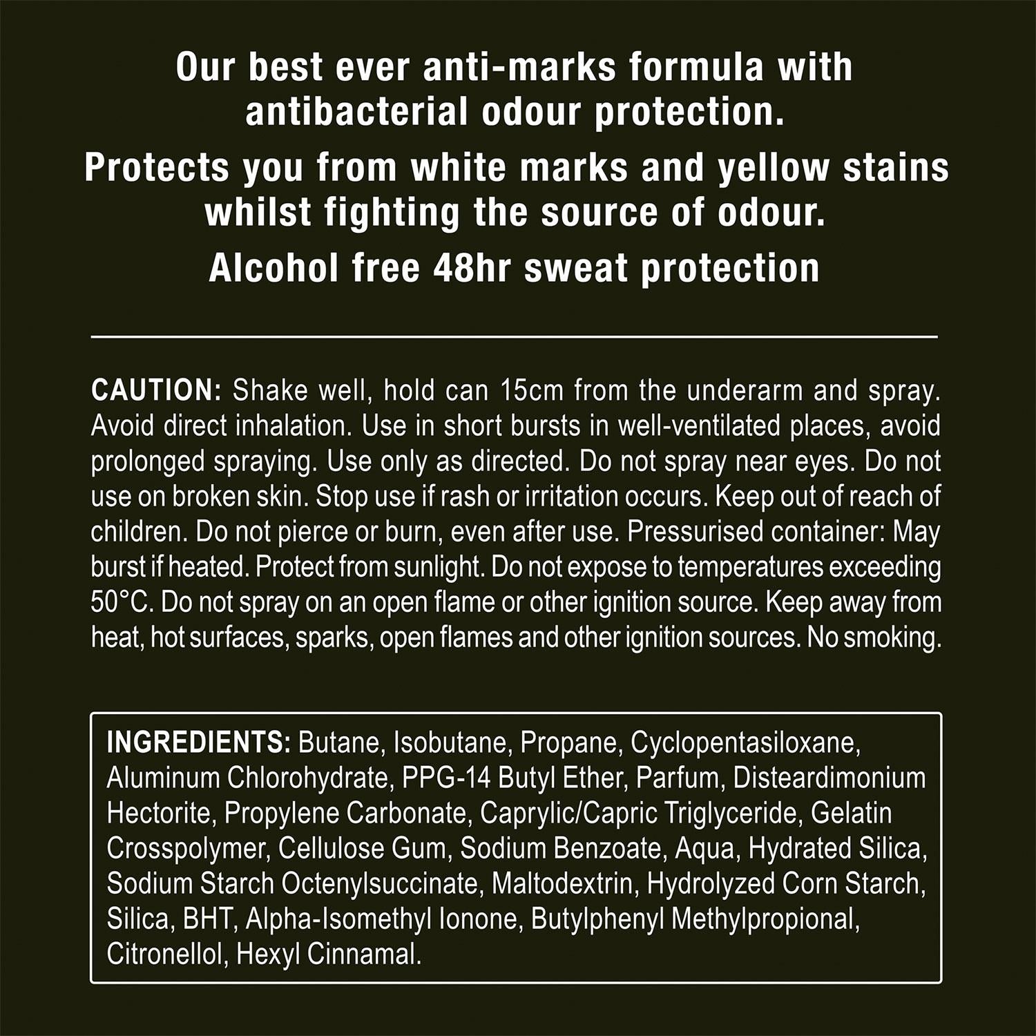Caution : Shake well, hold can 15cm from the underarm and spray. Avoid direct inhalation. Use in short bursts in well-ventilated places, avoid prolonged spraying. Use only as directed. Do not spray near eyes. Do not use on broken skin. Stop use if rash or irritation occurs. Keep out of reach of children. Do not pierce or burn, even after use.