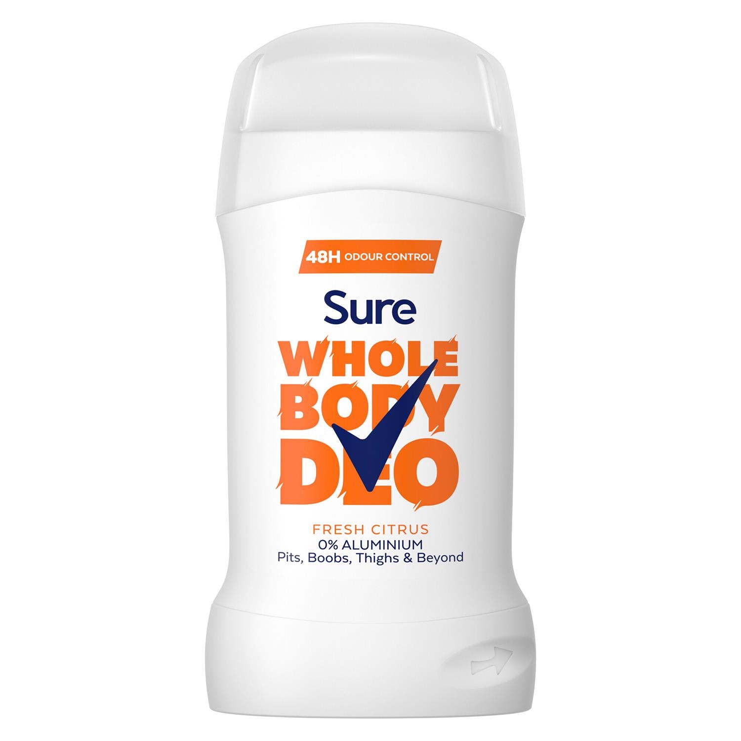 Sure Women Whole Body Deodorant Stick Fresh Citrus Aluminium Free 50ml, 3 Pack Stay fresh all over with Sures Whole Body Deodorant. This aluminium-free Whole Body Deodorant provides 72 hours of odour control so you can overcome your limits. Sures Whole Body deodorant spray features its patented Odour Adapt Technology, which stops odour before it starts. Simple spray this Whole Body Deodorant wherever you want to fight odour, avoiding your face. Our Whole Body Deodorant for men features a herbal, woody scent with a dynamic and clean feel. Use it wherever you need to control odour all over including your pits, privates, feet and beyond. This deodorant spray works over a large surface area, making it a convenient choice. It feels light and refreshing on the skin, leaves less residue, and dries quickly providing nearly instant freshness. Only Sure Whole Body Deodorant spray adapts to you wherever you need it so you can overcome your limits. At Sure, we want to inspire confidence in everyone to move more and go further. Were here to support your journey with an aluminium free deodorant that keeps you fresh all over. Sure. It wont let you down. Features: Keep fresh all over with Sures Whole Body Deodorant. 48 hours of whole body odour control so you can overcome your limits. This deodorant is suitable for the whole body, it features our unique Odour Adapt Technology, which stops odour before it starts. Its simple to apply. Glide on anywhere you want to fight odour. Sures Fresh Citrus Whole Body Deodorant for women features a fresh and airy fragrance with a pure, clean feel. Stay fresh all over with this odour control deodorant. Use it anywhere you want to tackle odour, including your pits, boobs, feet, privates and beyond. Dermatologically & Gynaecologically Tested. Certified by the British Skin Foundation. At Sure, we want to inspire confidence in everyone to move more and overcome your limits. Were here to support your journey with an aluminium-free deodorant that keeps you fresh all over. How to Use: Twist the bottom of your women's antiperspirant deodorant for two clicks to release enough cream for both underarms. INGREDIENTS: Aqua, Glycerin, Propylene Glycol, Dipropylene Glycol, Sodium Stearate, Poloxamine 1307, Parfum, Stearyl Alcohol, Stearic Acid, Disodium EDTA, Alpha-Isomethyl Ionone, Benzyl Alcohol, Citronellol, Citrus Aurantium Bergamia Peel Oil, Citrus Aurantium Peel Oil, Citrus Limon Peel Oil, Geraniol, Hexyl Cinnamal, Hydroxycitronellal, Limonene, Linalool, Linalyl Acetate, Pinene, Tetramethyl Acetyloctahydronaphthalenes, Trimethylbenzenepropanol. Box Contains: 3x Sure Women Whole Body Deodorant Stick, 50ml