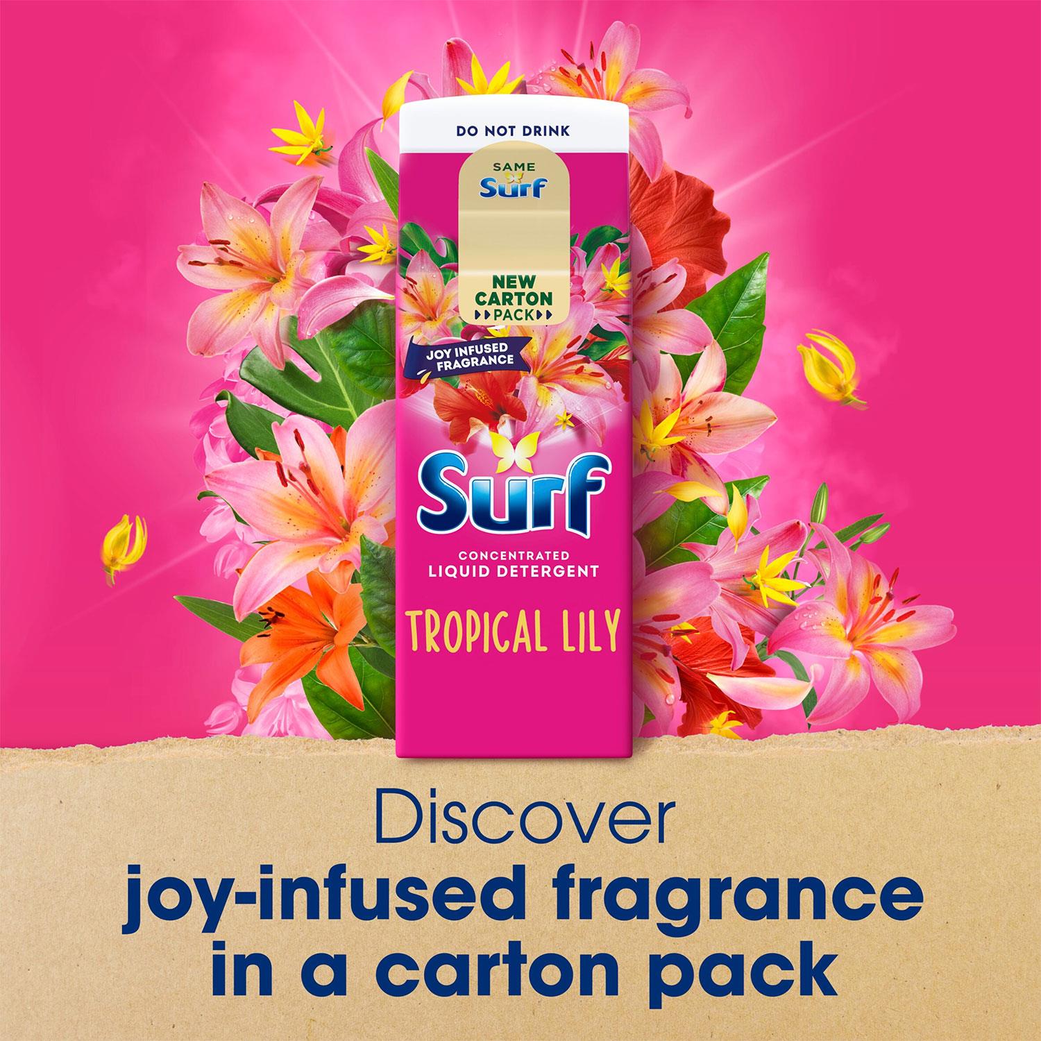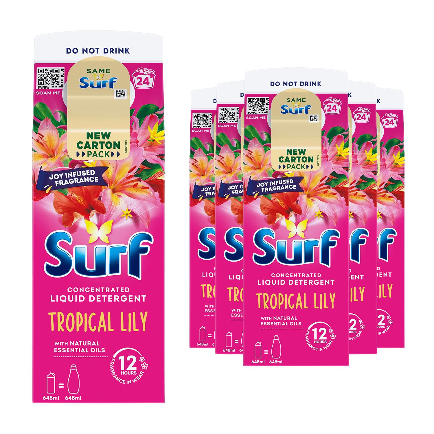 Surf Laundry Liquid Detergent Tropical Lily 24 Washes Deep Fabric Clean, 648ml, 6pk Surf Laundry Liquid Detergent Tropical Lily 24 Washes (648ml) offers a powerful and convenient cleaning solution for everyday laundry. Formulated to tackle everyday stains, dirt, and grime, this detergent is gentle on fabrics while providing a deep clean. The Tropical Lily fragrance leaves clothes fresh and pleasantly scented, ensuring a delightful laundry experience for you and your family. Each bottle delivers 24 washes, making it a cost-effective and reliable option for maintaining hygienically clean laundry. Features: Powerful liquid detergent - removes everyday stains effectively Tropical Lily fragrance - leaves laundry fresh and pleasantly scented Suitable for all washing machines and water temperatures Ingredients: 5-15%: Anionic Surfactants; <5%: Non-ionic surfactants, Perfume, Polycarboxylates, Soap, Phosphonates, Enzymes, Optical brighteners, Alpha-Isomethyl Ionone, Citronellol, Geraniol, Hexyl Cinnamal, Limonene, Linalool, Methylisothiazolinone, Octylisothiazolinone. How to Use: Measure the recommended dose according to load size and water hardness, then add to the detergent compartment of your washing machine. Safety Warning: Keep out of reach of children. Avoid contact with eyes and skin. Box contains: 6x Surf Laundry Liquid Detergent Tropical Lily 648ml (24 Washes)