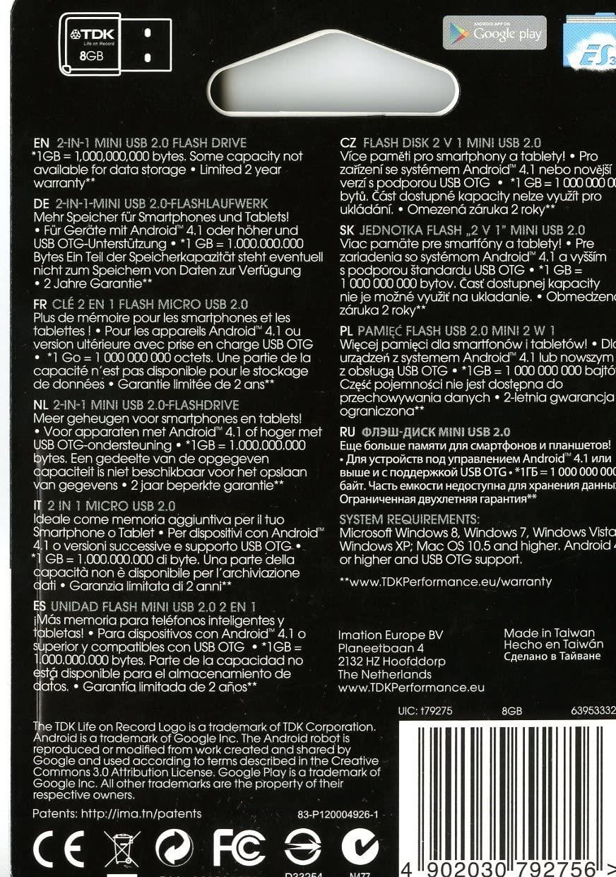 TDK Life on Record 2-in-1 Mini is an ultra-tact, lightweight and multi-purpose USB 2.0 stick with OTG (On-The-Go) technology. This device allows you to free up storage space on your Android™ devices by transferring photos and videos to a turnkey. With the built-in standard USB and micro USB connector, it's easy to transfer files from your Android device to your pc for backup, or to another compatible device for sharing music, photos and videos with friends and family.