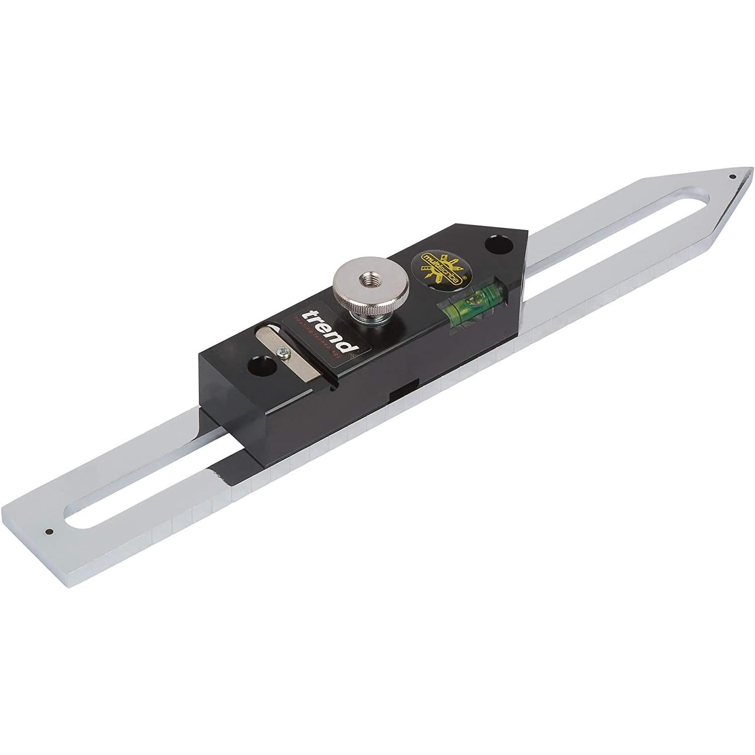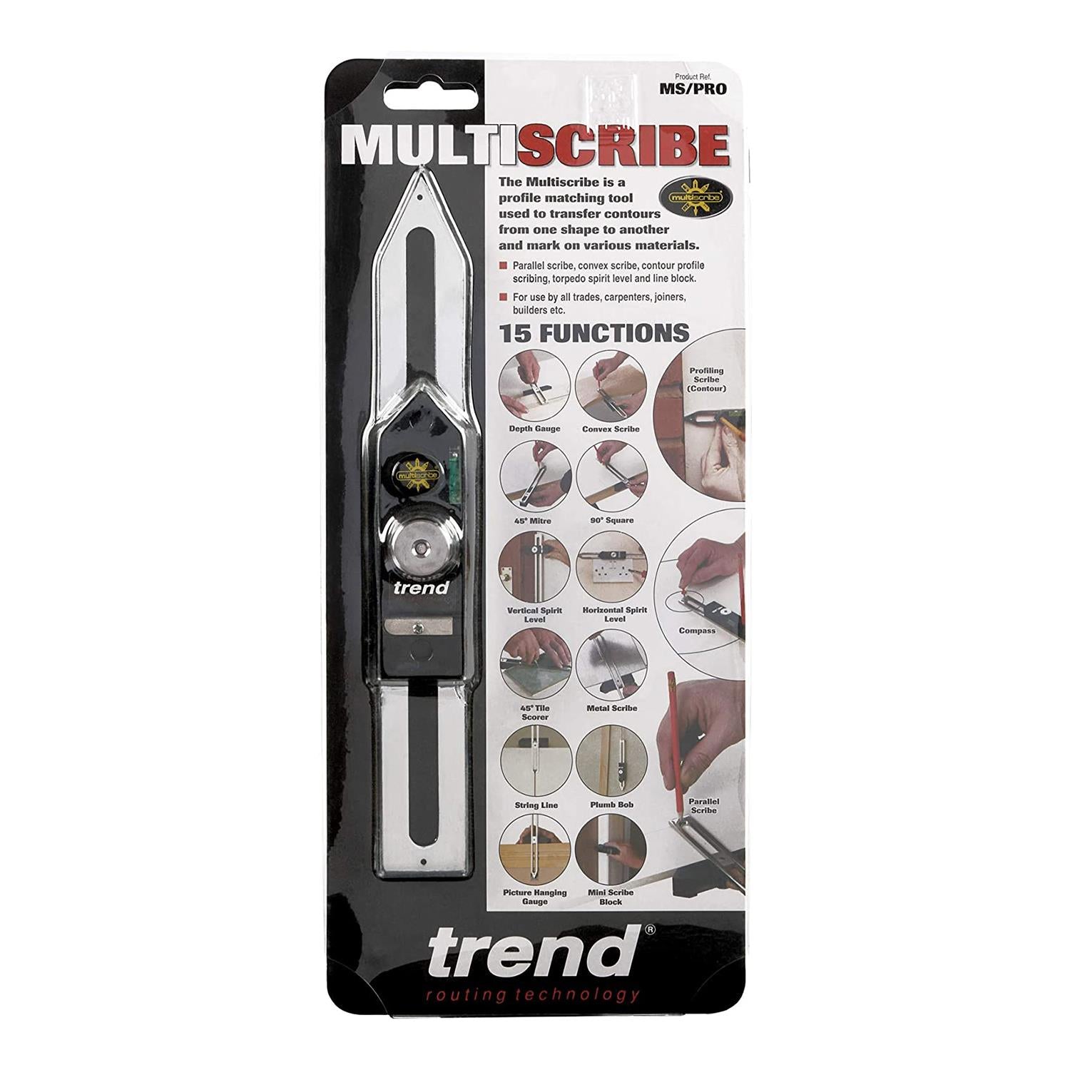 The Trend MS/PRO Multiscribe Profile Matching Tool scribes internal and external curves, marks parallel lines with fast, easy adjustable backset to suit the scribing gap. It also has a square and mitre function for layout work with precise 5mm increments on the blade, ideal for accurate checking and transferring depths of mortices, grooves and rebates. The two accurate pencil positions allow for marking narrow and wider circles and arcs or transferring scribe marks backsets.