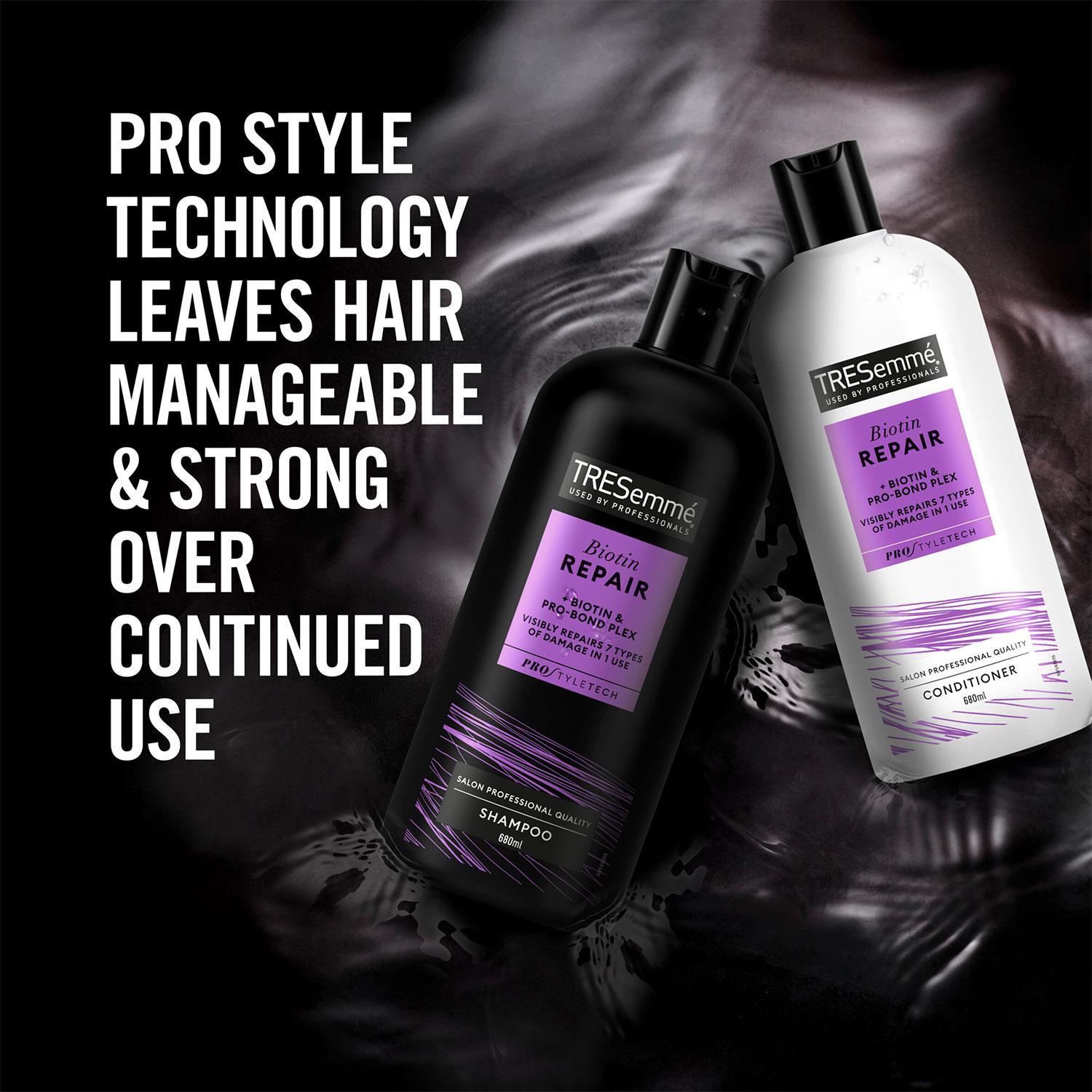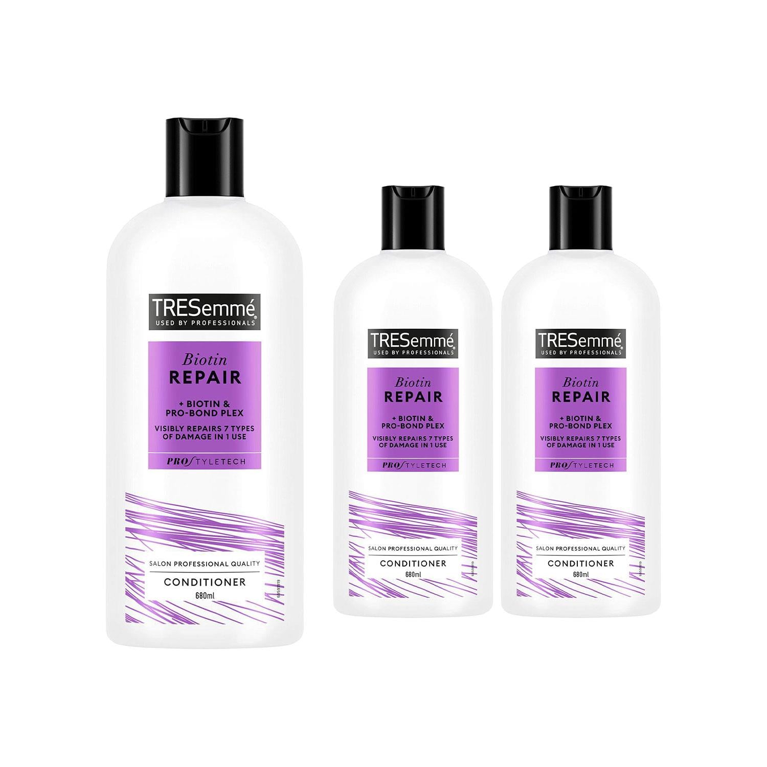Tresemme Conditioner Biotin Repair Visibly Repairs 7 Types of Damage 680ml, 3 Pack If you blow-dry, bleach, brush, straighten, colour, braid or curl your hair, it�s likely to encounter some amount of damage. Tresemme Biotin Repair Conditioner is specifically designed to visibly repair and heal hair that�s been damaged from these seven hairstyling methods. Formulated with Pro-Bond Plex and Biotin, it strengthens each strand of hair inside and out while protecting fibres and restoring broken bonds. Its professional-quality formula uses our PRO Style Technology with amino acids and ceramide to leave damaged hair strong and manageable with continuous use. Start your routine with Tresemme Biotin Repair Shampoo. Features: Tresemme Biotin Repair Conditioner visibly repairs 7 types of damage in just one use This professional-quality conditioner features Biotin, Pro-Bond Plex and PRO Style Technology which work from the inside out to leave damaged hair strong and manageable with continued use Our conditioner repairs broken bonds and protects fibres, whether you blow-dry, bleach, brush, straighten, colour, braid or curl your hair Our hair care experts are at the forefront of science and safety � every ingredient is carefully selected to ensure your hair receives the best possible care How to Use: After shampooing, distribute conditioner evenly through damp hair, leave on for 2-3 minutes, then rinse thoroughly. Ingredients: Aqua, Cetearyl Alcohol, Dimethicone, Stearamidopropyl Dimethylamine, Parfum, Behentrimonium Chloride, Lactic Acid, Dipropylene Glycol, Amodimethicone, Gluconolactone, Sodium Chloride, Trehalose, Disodium EDTA, Phenoxyethanol, Cetrimonium Chloride, PEG-7 Propylheptyl Ether, Magnesium Nitrate, Sodium Sulfate, Biotin, Ethylhexyl Methoxycinnamate, Arginine, Lysine HCl, Ceramide NG, Methylisothiazolinone, Methylchloroisothiazolinone, Benzyl Alcohol, Benzyl Salicylate, Hexyl Cinnamal, Limonene, Linalool Box Contains: 3x Tresemme Conditioner Biotin Repair, 680ml