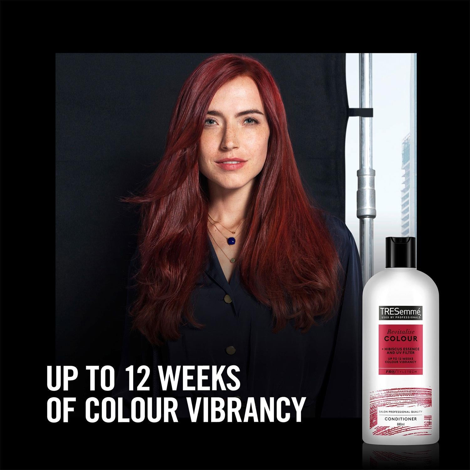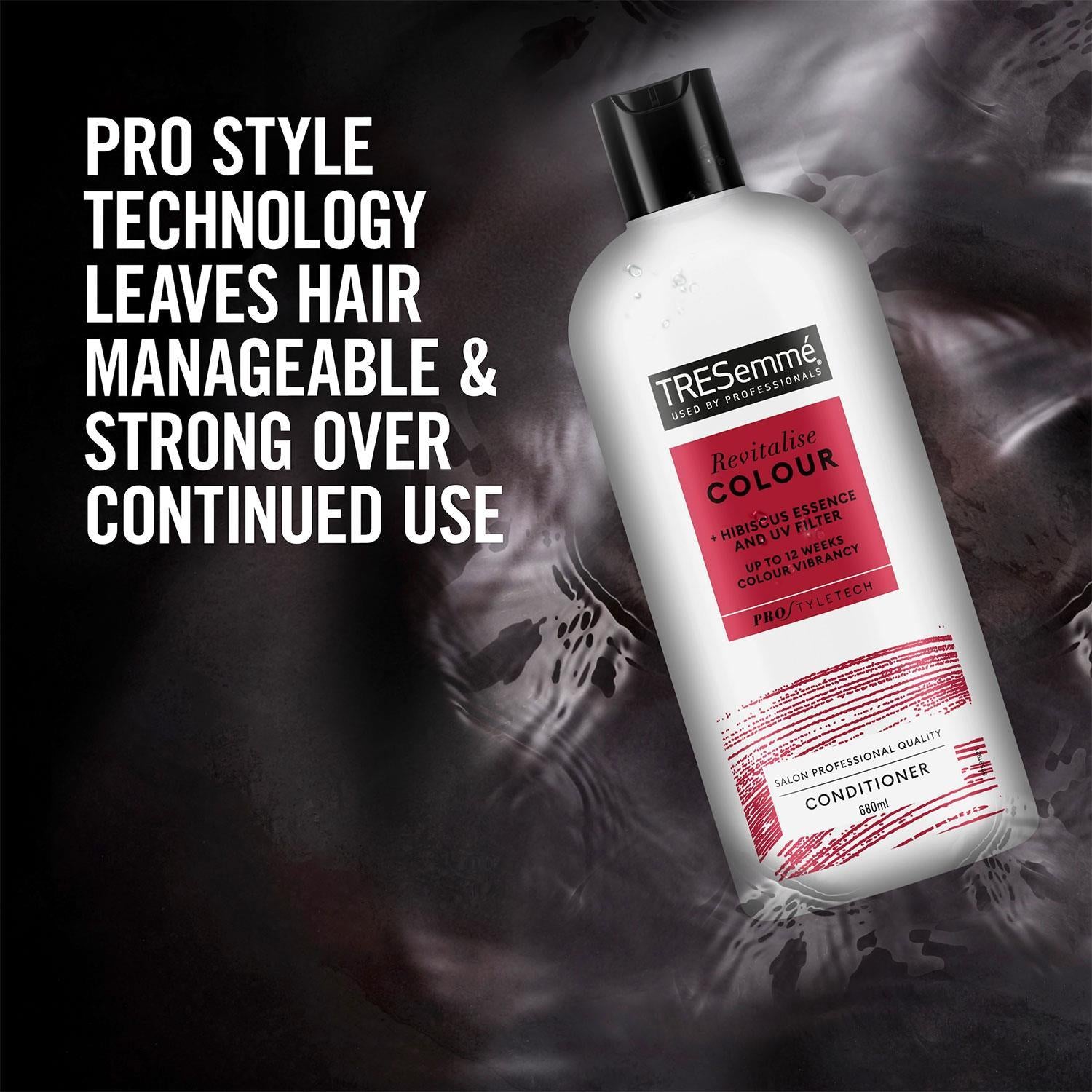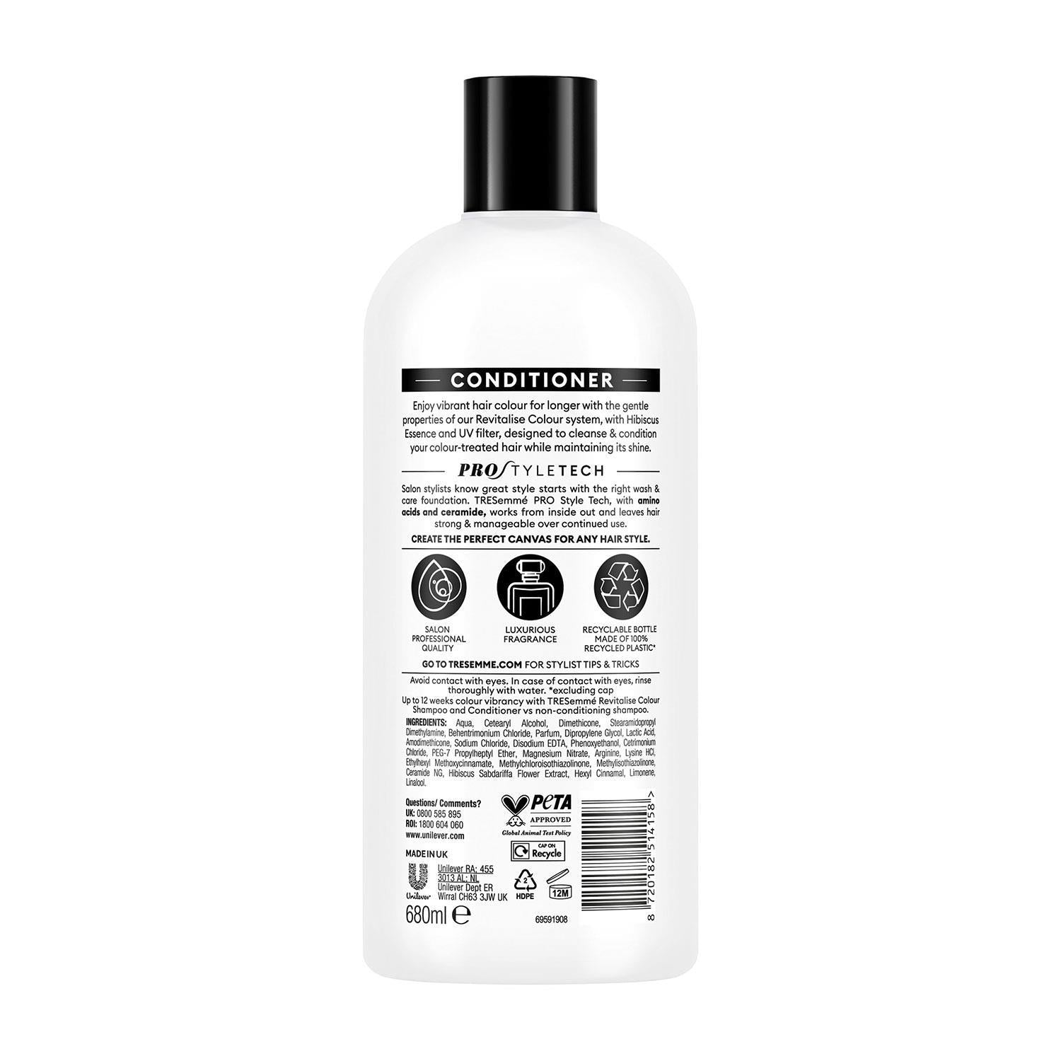 Tresemme Conditioner Revitalise Colour with Hibiscus Essence & UV Filter, 3x 680ml Blow-drying, heat-styling and repeated washing can cause coloured hair to fade and lose its vibrancy. You can now enjoy your vibrant hair colour for longer with Tresemme Revitalise Colour Conditioner. Formulated with hibiscus essence and a UV filter, this professional-quality conditioner is designed to infuse your hair with moisture and provide it with up to 12 weeks of colour vibrancy*. With our professional-quality care, a world of style possibilities is yours to achieve. Every choice we make at Tresemme, from the values we promote � such as not testing on animals and being PETA approved � to the stylists we work with, right down to the carefully selected ingredients we use, are made with intention and inspired by the latest trends and style. Because 70 years on, we believe in the power of style. Its gentle formula uses our PRO Style Technology with amino acids and ceramides to leave your hair strong and manageable with continuous use. To give your hair a nourished and healthy-looking shine, start your routine with Tresemme Revitalise Colour Shampoo. Then, squeeze a generous amount of Revitalise Colour Conditioner into the palms of your hands and distribute evenly through damp hair, focusing on ends to mid-lengths first, and working any remaining conditioner up toward the roots. Leave on for 2�3 minutes, then rinse thoroughly. Style with your favourite Tresemme styling products as needed. pack of 3