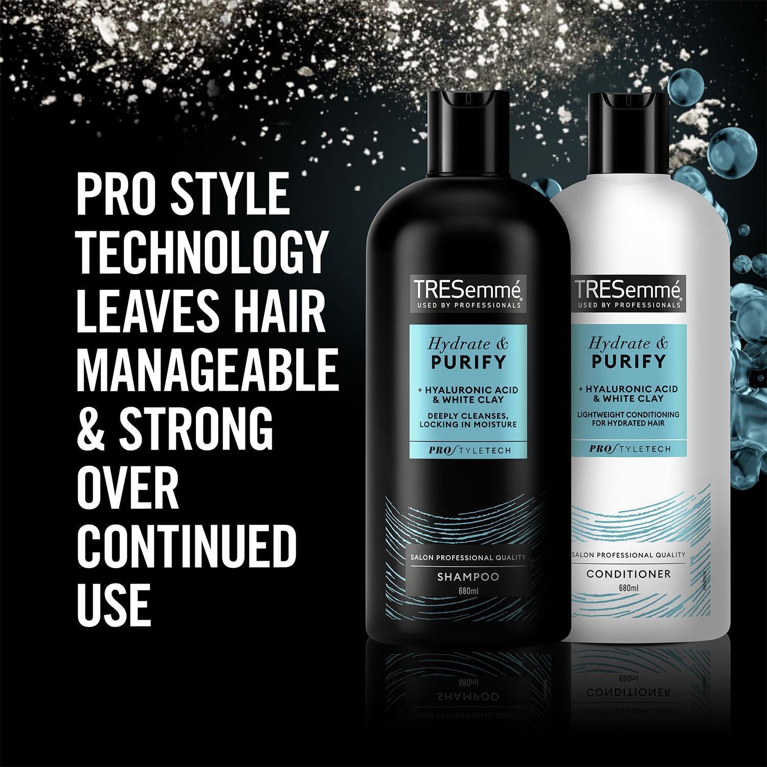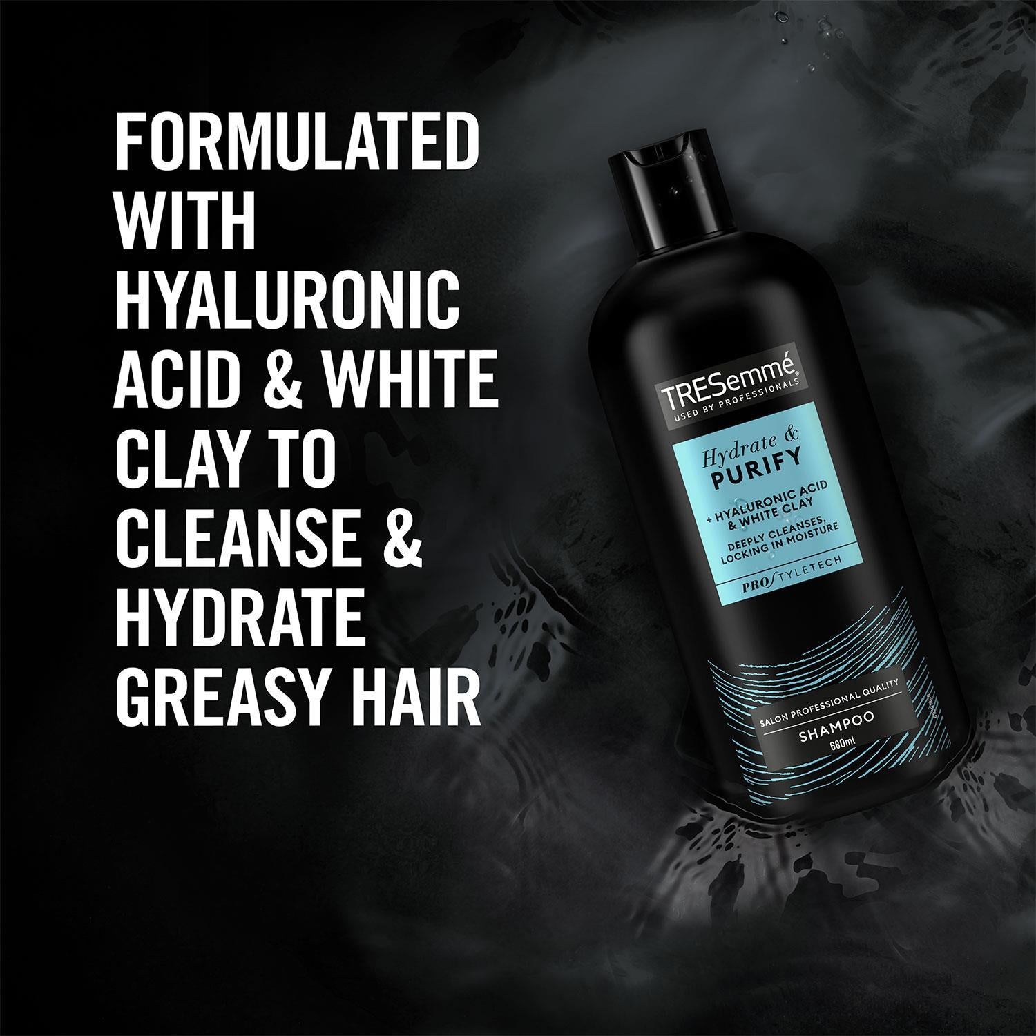 Tresemme Shampoo Hydrate & Purify for Greasy Hair with Hyaluronic Acid, 3x680ml The Hydrate & Purify shampoo and conditioner system is formulated with hyaluronic acid and white clay to deeply cleanse and purify hair, locking in moisture. This shampoo is suitable for daily use. Features: Suitable for daily use Deeply cleans and purifies hair, locking in moisture Formulated with hyaluronic acid and white clay Deeply cleanses your hair straight from the scalp How to Use: Apply to wet hair, lather, rinse, and repeat if necessary. Ingredients: Aqua, Sodium Laureth Sulfate, Cocamidopropyl Betaine, Sodium Chloride, Parfum, Sodium Benzoate, Glycerin, Carbomer, Glycol Distearate, Citric Acid, Disodium EDTA, Cocamide MEA, Polyquaternium-10, Kaolin, Hydrolyzed Hyaluronic Acid, Arginine, Lysine HCl, Ceramide NG, Sodium Hydroxide, PPG-6, Benzyl Alcohol, Benzyl Salicylate, Geraniol, Limonene Box Contains: 3x Tresemme Shampoo Hydrate & Purify 680ml