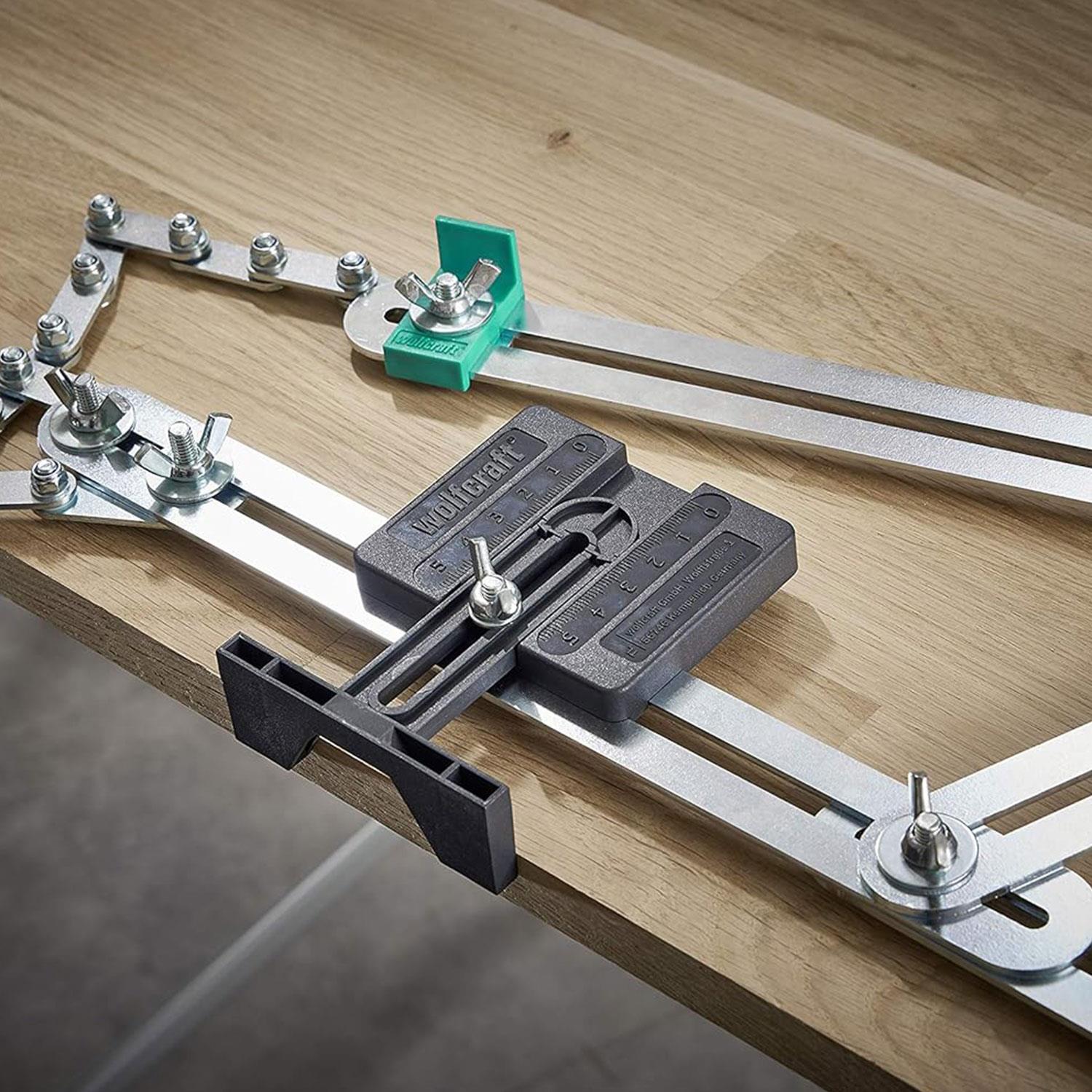 Renovating an old wooden staircase is one of the most ambitious DIY projects out there. However, the stair gauge dramatically simplifies the process of measuring the steps, even in old spiral staircases: it helps you to master unequal angles and curves as well as take account of expansion joints and material allowances with ease. The stair gauge combines the advantages of a stair spider with those of a conventional template or angular bevel gauge. Integrated expansion joint wedges and adapters for the material allowance (e.g. for the steps) complete the set. High-quality bolts with wing nuts hold the template securely in position so that you can transfer the dimension to the workpiece confidently and without errors.